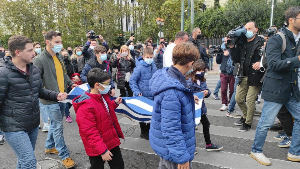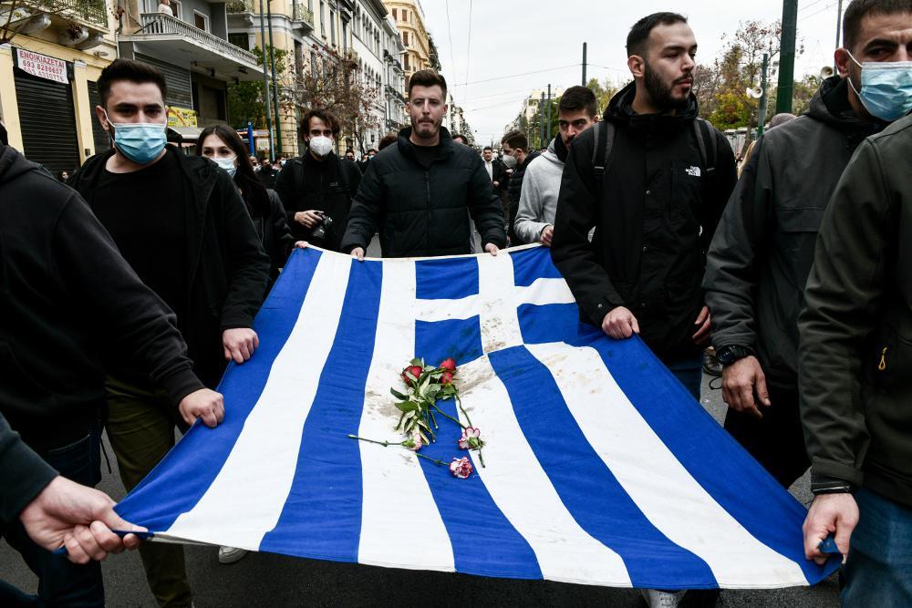 Η αντιπροσωπεία των φοιτητών με τη σημαία της εξέγερσης έφτασε λίγο πριν τις 17.00 μπροστά στην πρεσβεία, ενώ κατά τη διάρκεια της πορείας, την σημαία κράτησαν και παιδιά.