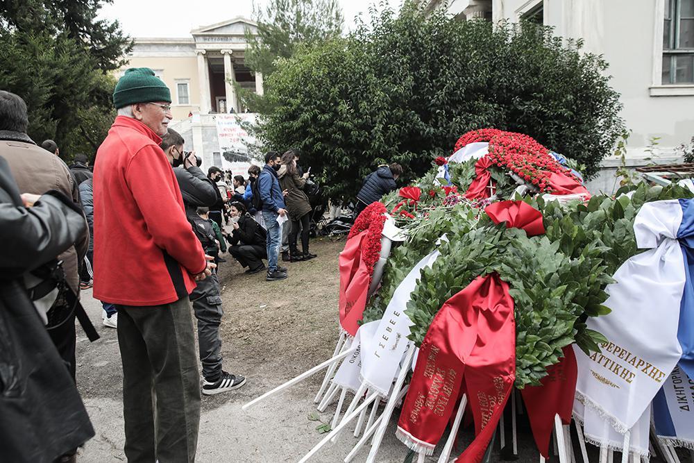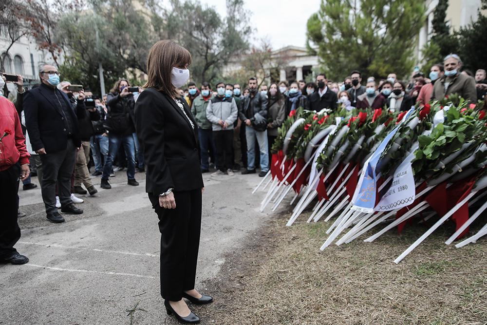 Η Πρόεδρος της Δημοκρατίας Κατερίνα Σακελλαροπούλου κατέθεσε στεφάνι σήμερα το πρωί στο Πολυτεχνείο για τον εορτασμό της 48ης επετείου από την εξέγερση κατά της δικτατορίας των συνταγματαρχών.
