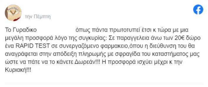 Η ανάρτηση αναφέρει ότι το συγκεκριμένο κατάστημα «όπως πάντα πρωτοτυπεί έτσι κ τώρα με μια μεγάλη προσφορά λόγο της συγκυρίας: Σε παραγγελία άνω των 20€ δώρο ένα RAPID TEST σε συνεργαζόμενο φαρμακειο, όπου η διεύθυνσή του θα αναγράφεται στην απόδειξη πληρωμής με σφραγίδα του καταστήματος μας ώστε να πάτε να το κάνετε Δωρεάν!!! Η προσφορά ισχύει μέχρι κ την Κυριακή!!!».