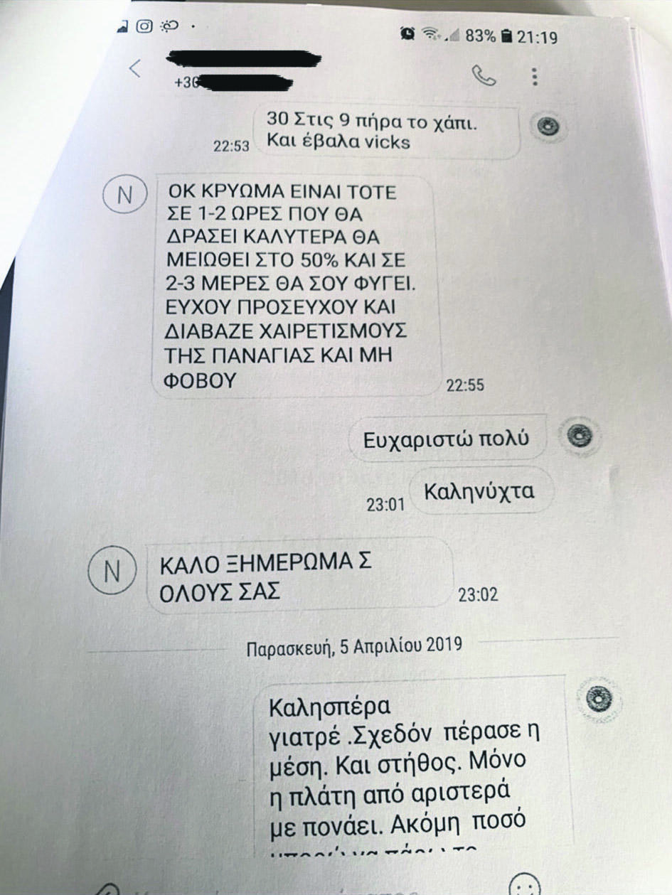 Παράλληλα με τα μαντζούνια συνιστούσε πάντα και προσευχή «Τότε μη φοβού, είσαι ΟΚ. Απλά, διαβάζει τα καρκινικά κύτταρα σε απόπτωση, όπως σου εξήγησα χθες. Οταν οι δείκτες φλεγμονής είναι τόσο νορμάλ και τόσο χαμηλά, ειδικά στο CRP, δεν μπορεί να υπάρχει όγκος που ν’ αυξάνει, καθώς είναι το πρώτο που μεγαλώνει πριν απ’ όλες τις μετρήσεις, οπότε χαμογέλα, κάνε την προσευχή σου, άναψε κι ένα κεράκι στην Παναγία και συνέχισε. Φιλιά πολλά», έγραφε σε άλλη περίπτωση. Ακόμα και διάγνωση για κρύωμα έκανε από το τηλέφωνο «Στις 9 πήρα χάπι κι έβαλα Vicks», γράφει ασθενής κι εκείνος απαντάει: «ΟΚ, κρύωμα είναι τότε. Σε 1-2 ώρες, που θα δράσει καλύτερα, θα μειωθεί στο 50% και σε 2-3 μέρες θα σου φύγει. Εύχου, προσεύχου και διάβαζε Χαιρετισμούς της Παναγίας και μη φοβού».