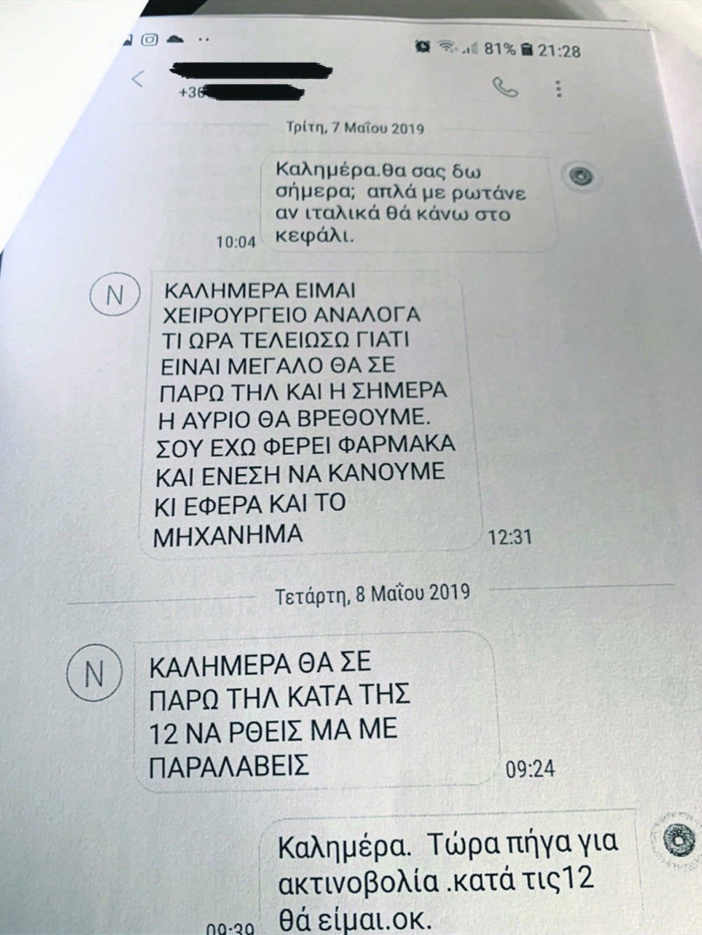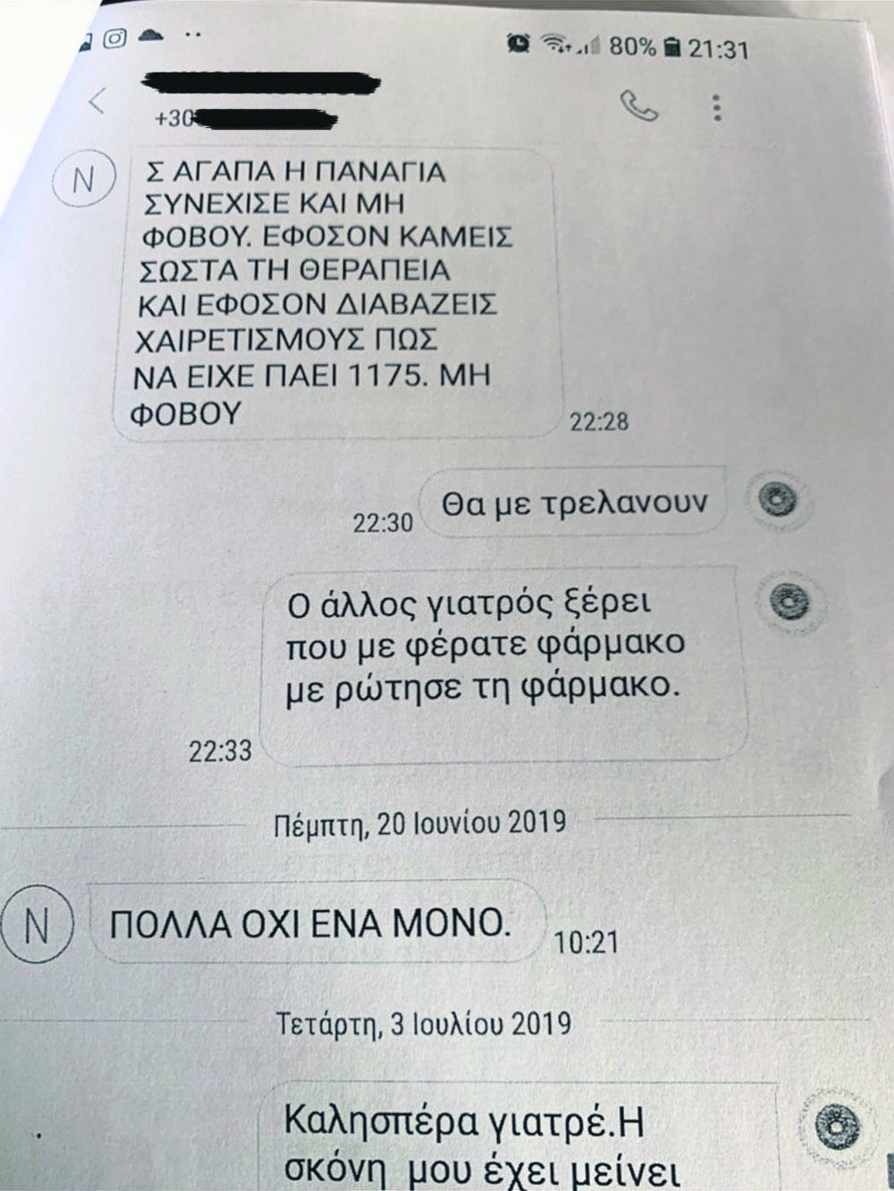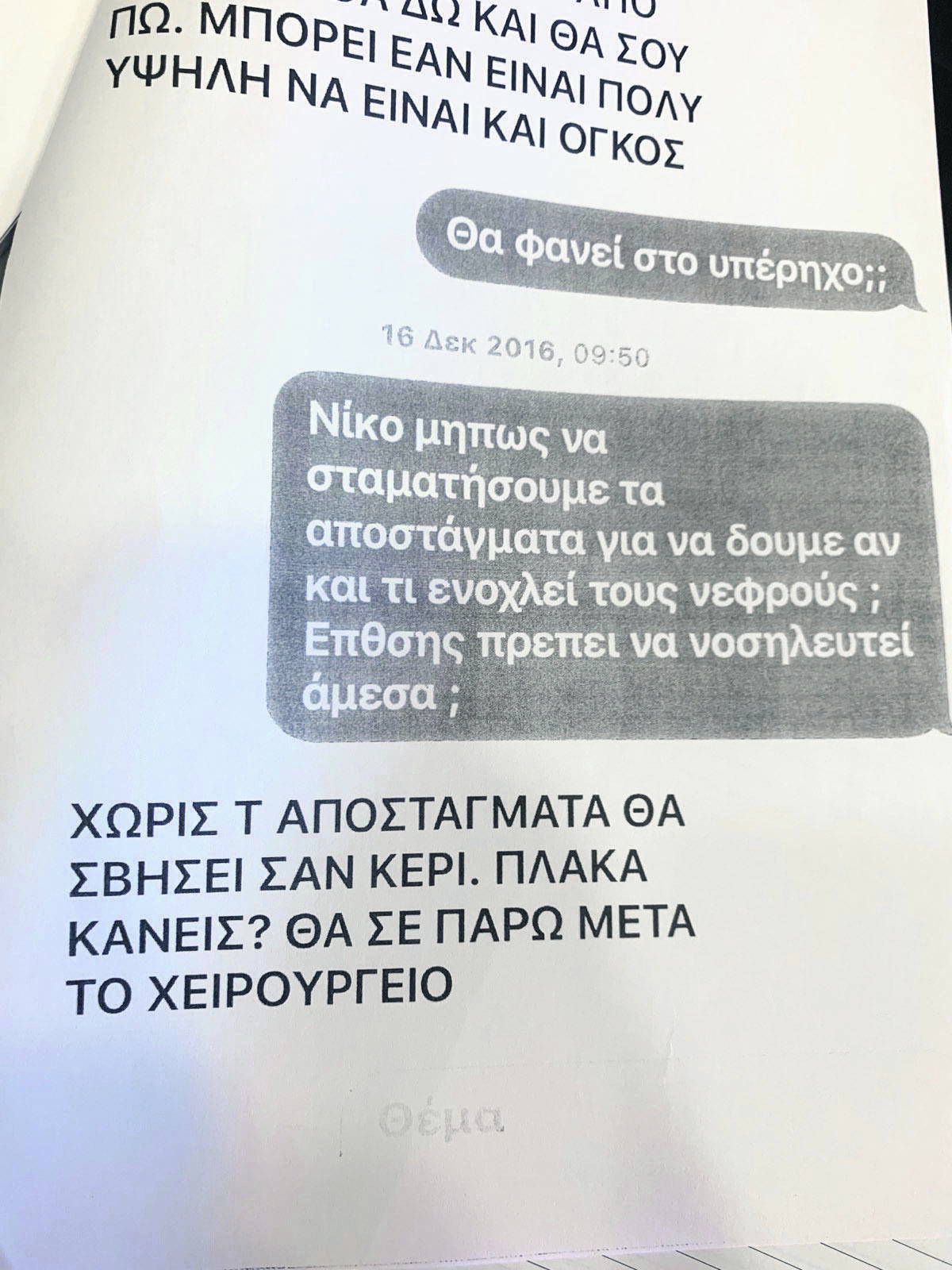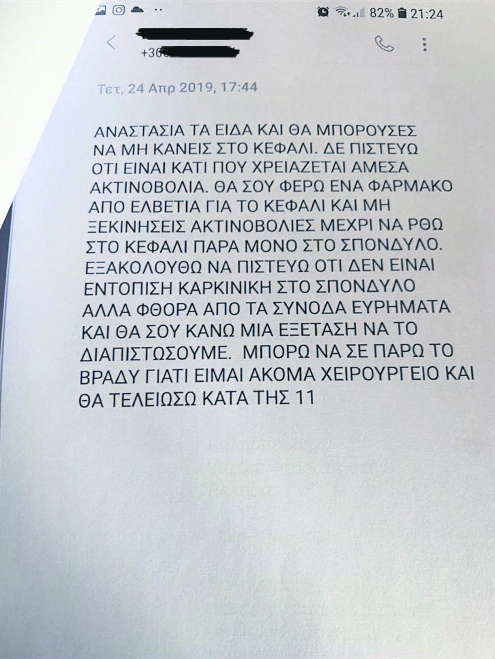 Σε άλλη ασθενή έταζε φάρμακα από το εξωτερικό για να την πείσει να μην προχωρήσει σε ακτινοβολίες. «Τα είδα και θα μπορούσες να μην κάνεις στο κεφάλι, δεν πιστεύω ότι είναι κάτι που χρειάζεται άμεσα ακτινοβολία. Θα σου φέρω ένα φάρμακο από Ελβετία για το κεφάλι και μην ξεκινήσεις ακτινοβολίες, μέχρι να ’ρθω, στο κεφάλι», έγραψε παίζοντας τον ρόλο του γιατρού.