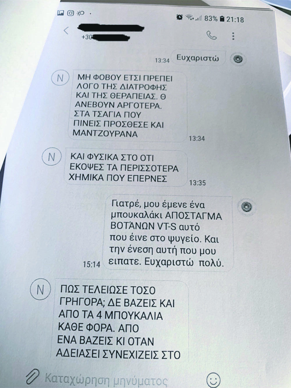 Σε άλλη περίπτωση και χρησιμοποιώντας συνεχώς τη φράση «Μη φοβού» εφευρίσκει νέο φάρμακο από αρωματικά φυτά και καθησυχάζει ασθενή που πέφτουν οι τιμές στις εξετάσεις του γιατί τον έπεισε να διακόψει τις χημειοθεραπείες. «Μη φοβού, έτσι πρέπει λόγω της διατροφής και της θεραπείας. Θα ανέβουν αργότερα, στα τσάγια που πίνεις πρόσθεσε και μαντζουράνα. Και φυσικά στο ότι έκοψες τα περισσότερα χημικά που έπαιρνες», γράφει αδιαφορώντας για τις συνέπειες στους ασθενείς που είχε καταφέρει να ξεγελάσει.
