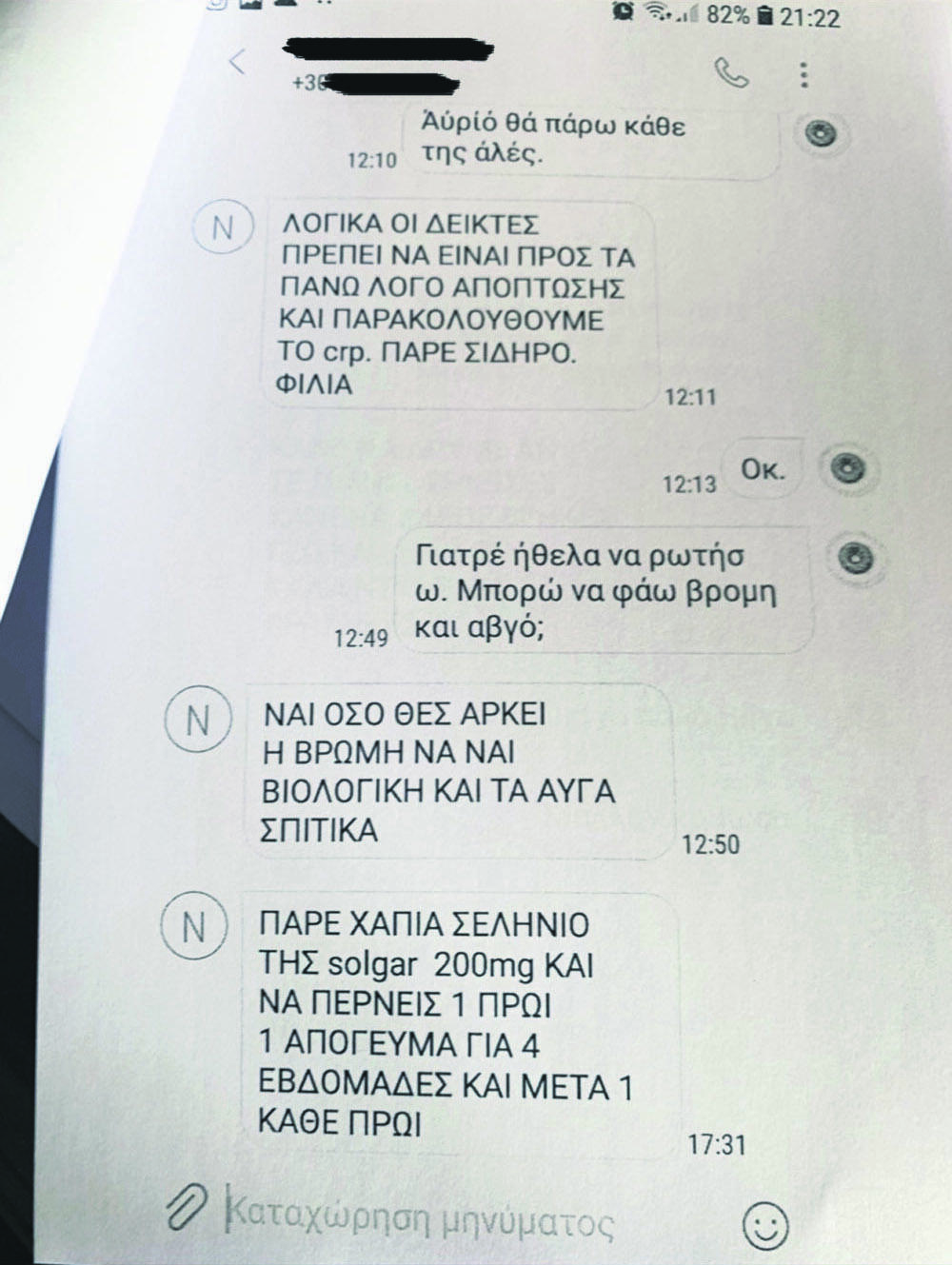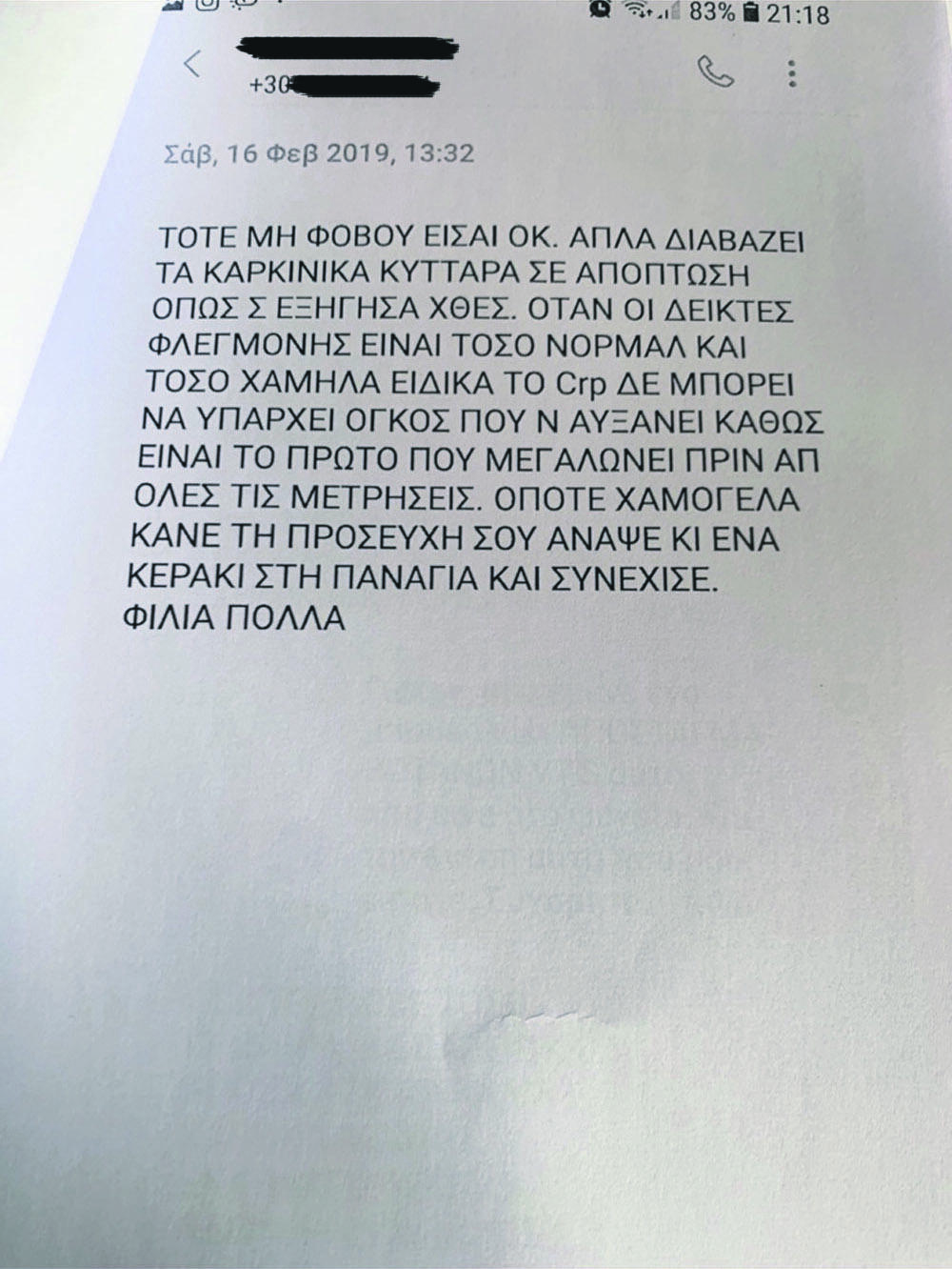 «Τα νέα νούμερα πες μου και θα δω. Το πιο σίγουρο είναι ότι είναι ψευδείς μετρήσεις λόγω απόπτωσης καρκινικών κυττάρων, τα οποία φεύγουν μέσω του αίματος με ιδρώτα, ούρα και κόπρανα. Οταν σκοτώνονται τα καρκινικά κύτταρα, πρέπει να φεύγουν από τον οργανισμό και αυτό ονομάζεται απόπτωση. Οταν αυτά υπάρχουν στην κυκλοφορία του αίματος στην πορεία απόπτωσης εκτός οργανισμού λαμβάνουμε ψευδείς μετρήσεις στις εξετάσεις αίματος. Κάνε δύο εξετάσεις αίματος CRP και ΤΚΕ. Στείλε μου όμως τις νέες μετρήσεις», γράφει στον ασθενή.
