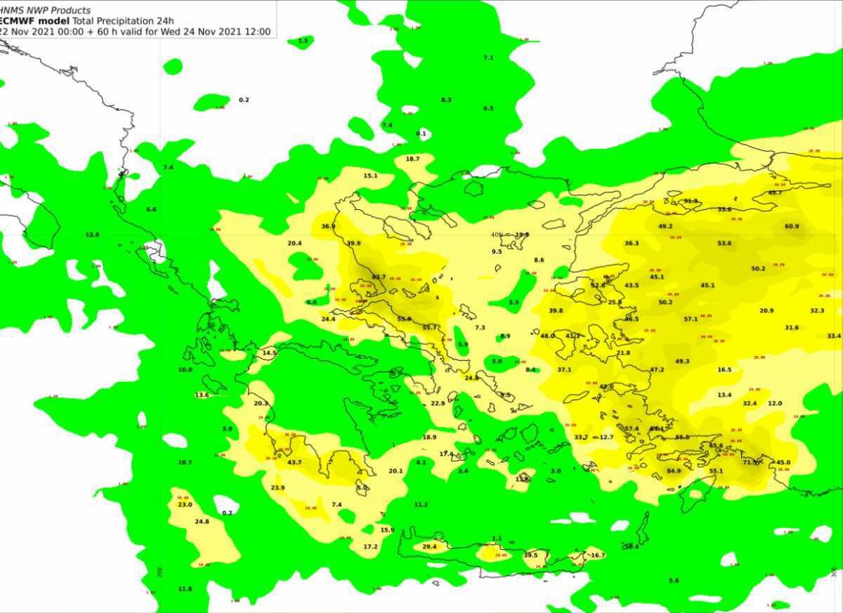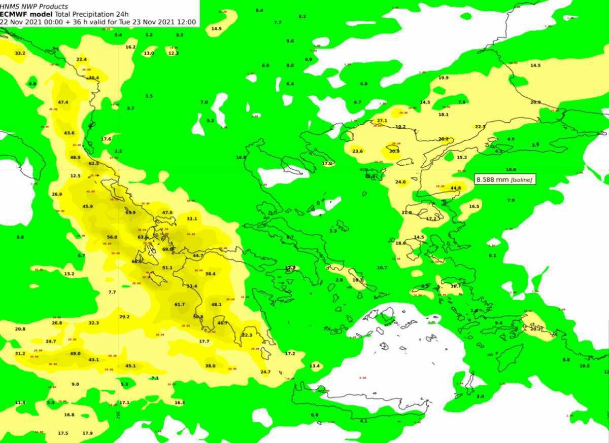 Την Τρίτη (23/11/2021) οι ισχυρές βροχές και καταιγίδες θα συνεχιστούν κατά διαστήματα στις προαναφερθείσες περιοχές και θα επεκταθούν, από τις πρώτες πρωινές ώρες στην ανατολική Μακεδονία, τη Θράκη, τα νησιά του βορείου και ανατολικού Αιγαίου και μετά το μεσημέρι στα Δωδεκάνησα. Από το απόγευμα πάντως τα ισχυρά φαινόμενα στα δυτικά θα εξασθενήσουν, αλλά θα επηρεάσουν πρόσκαιρα την ανατολική Θεσσαλία, τις Σποράδες, την Εύβοια, την ανατολική Πελοπόννησο, τις Κυκλάδες και πιθανώς τη νύχτα την Αττική. Στους χάρτες που ακολουθούν παρουσιάζονται τα ύψη βροχής 24ωρου . Στον πρώτο τα ύψη βροχής από Δεyτέρα έως και Τρίτη 12:00 UTC και στον επόμενο από Τρίτη έως Τετάρτη 12:00 UTC.