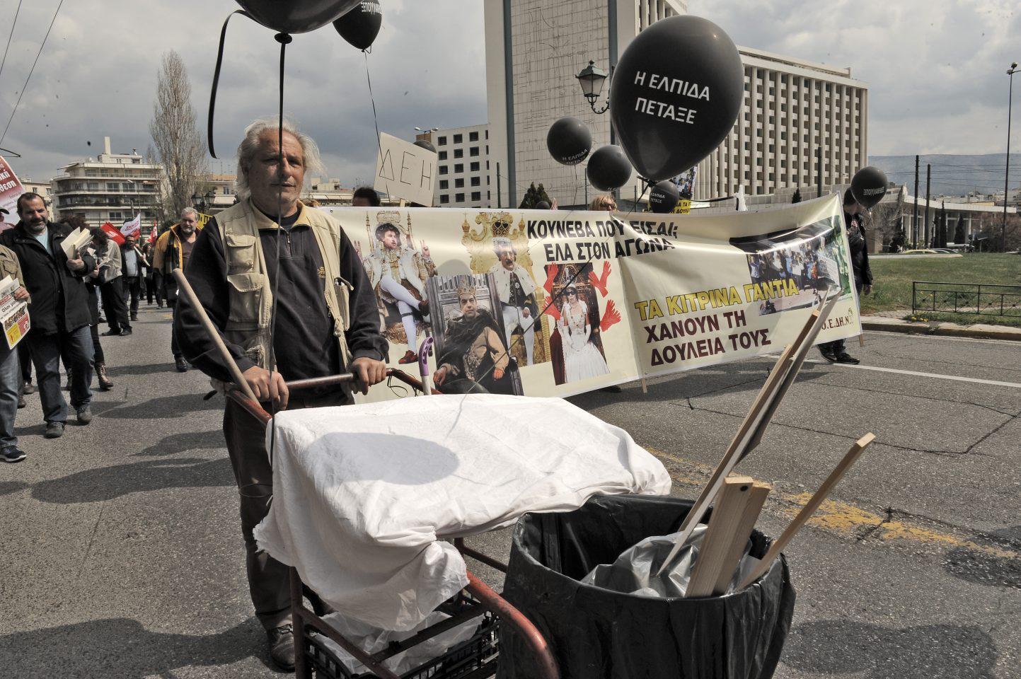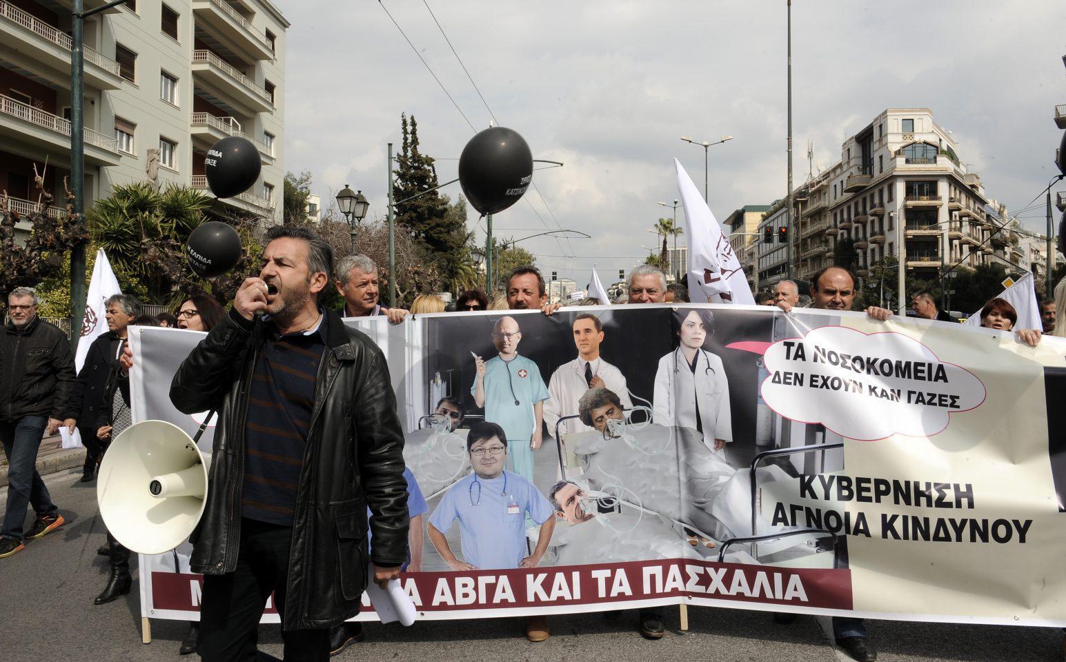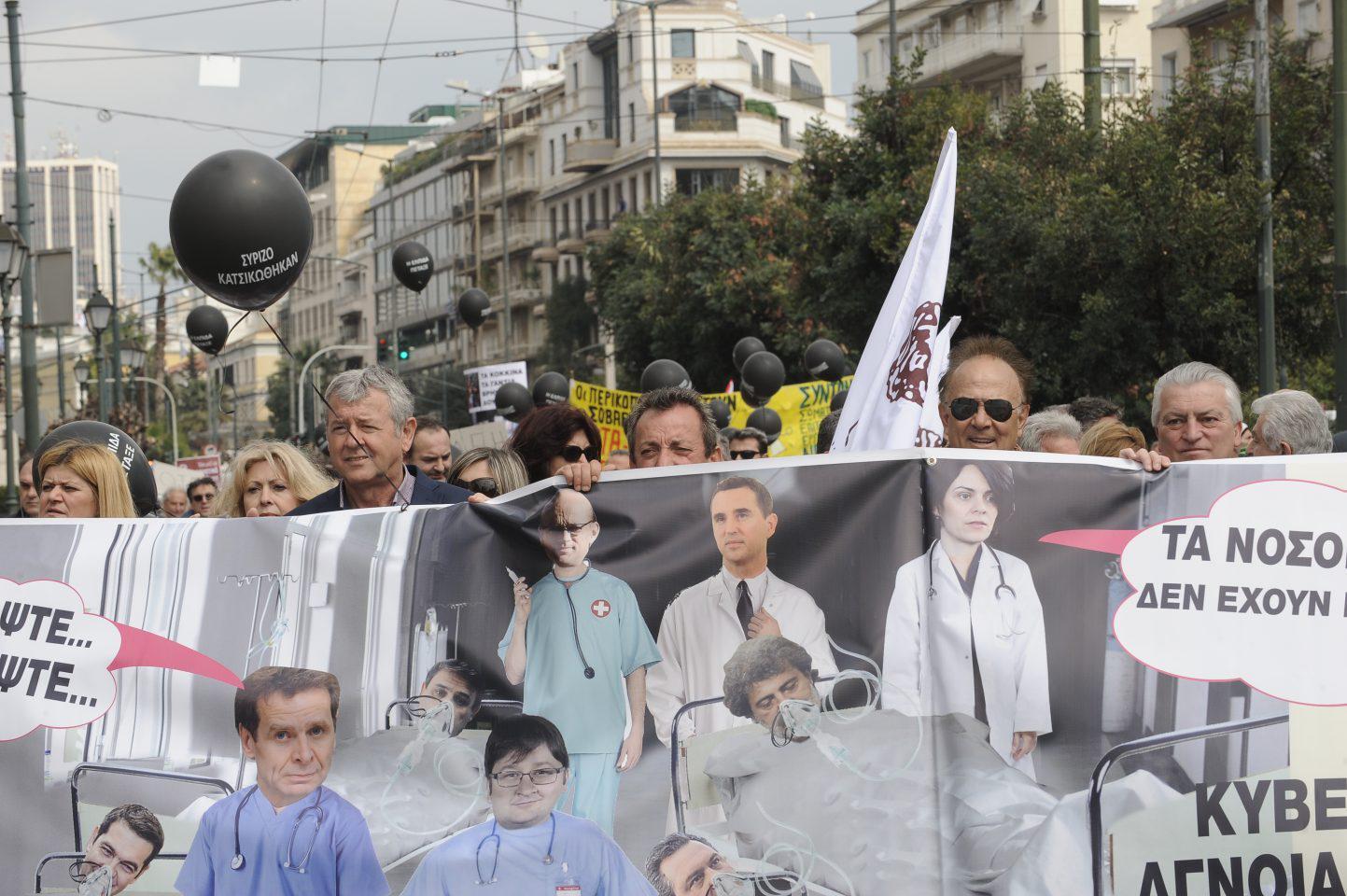 Οι γιατροί στη συγκέντρωση κρατούσαν πανό ενάντια στον πρωθυπουργό Αλέξη Τσίπρα, τον υπουργό Εθνικής Αμυνάς Πάνο Καμμένο, αλλά και ενάντια στους αρμόδιους υπουργούς Υγείας, ενώ σε μια συμβολική κίνηση τοποθέτησαν «ασθενή» σε καρότσα αγροτικού.