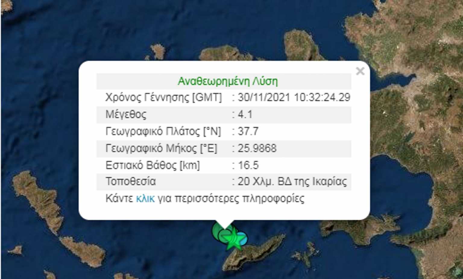 Σύμφωνα με το Γεωδυναμικό Ινστιτούτο ο σεισμός είχε επίκεντρο 20 χιλιόμετρα βορειοδυτικά της Ικαρίας, και εστιακό βάθος 16,5 χιλιόμετρα.