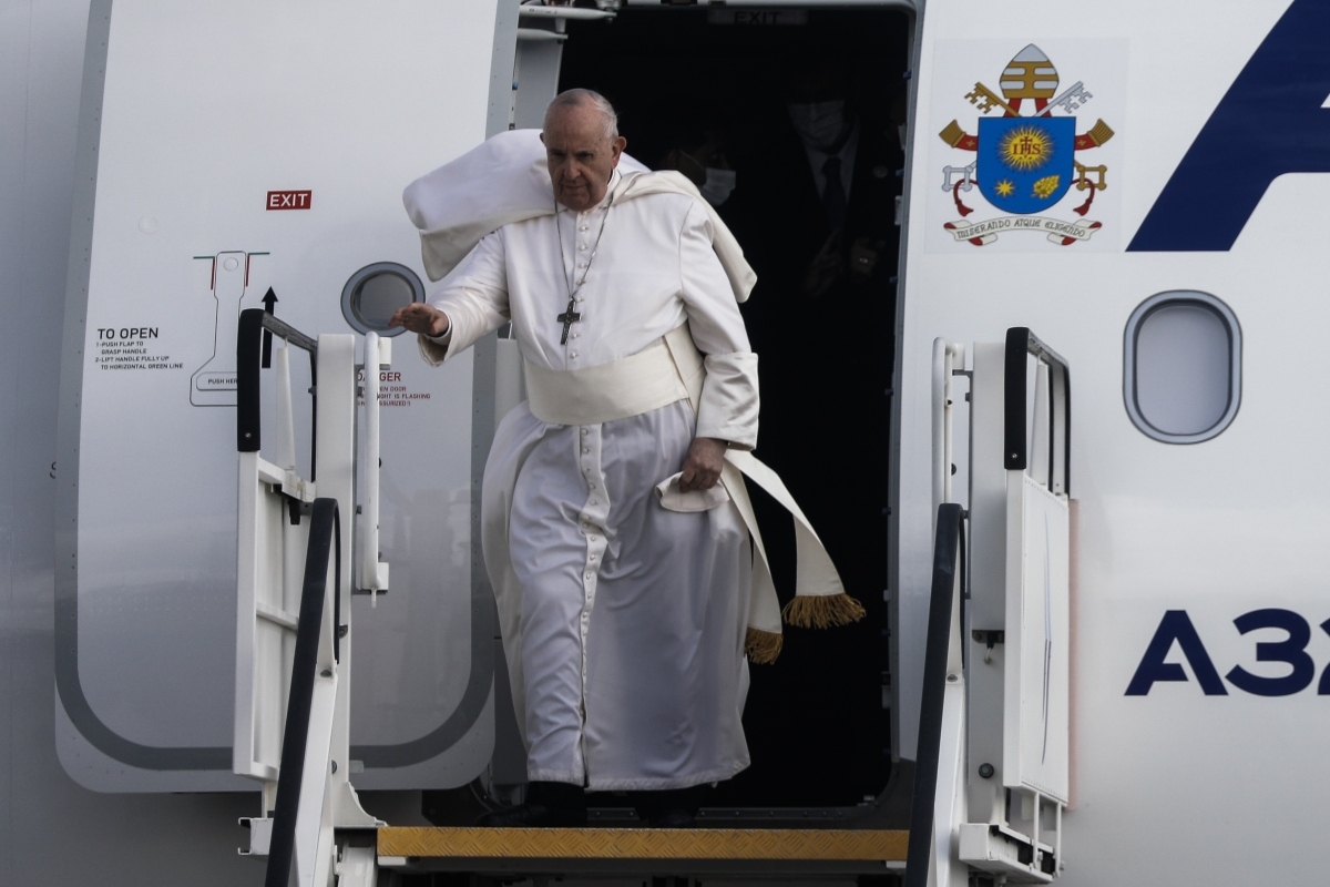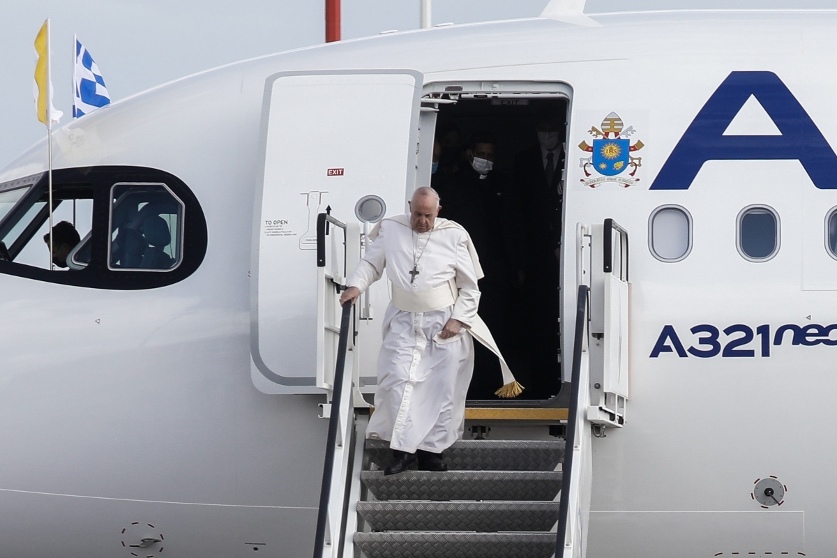 Ο Πάπας Φραγκίσκος έφτασε στην Αθήνα λίγο μετά τις 11:00 με πτήση της Aegean. Στο αεροδρόμιο τον υποδέχθηκε ο υπουργός Εξωτερικών Νίκος Δένδιας.
