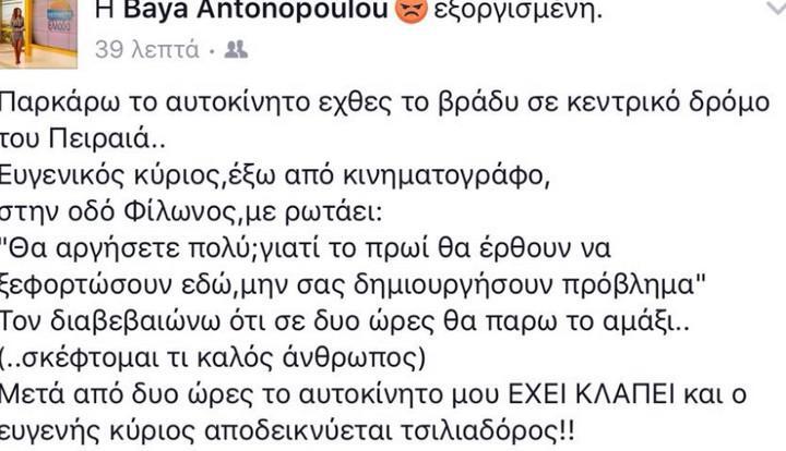 Στην οργισμένη ανάρτηση της στο Facebook, η Μπάγια Αντωνοπούλου περιγράφει το περιστατικό. Σύμφωνα με την περιγραφή της, μόλις είχε παρκάρει σε κεντρικό δρόμο του Πειραιά, όταν ένας άγνωστος την πλησίασε και την ρώτησε πόση ώρα θα έχει εκεί το αμάξι της, με το πρόσχημα ότι την επόμενη ημέρα το πρωί, στο συγκεκριμένο σημείο, θα ξεφορτώσουν πράγματα.