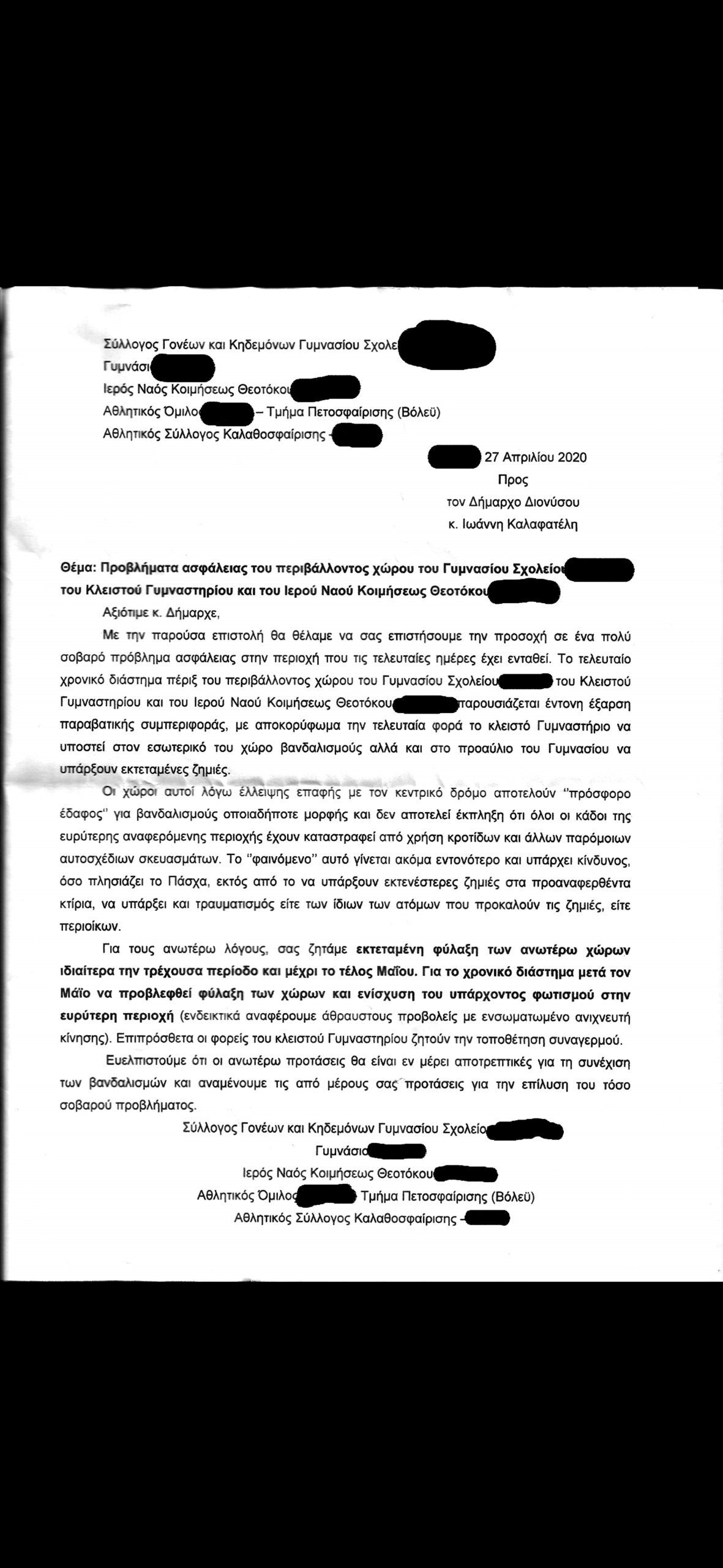 «Το τελευταίο χρονικό διάστημα πέριξ του περιβάλλοντος χώρου του Γυμνασίου, του Κλειστού Γυμναστηρίου και του Ιερού Ναού Κοιμήσεως Θεοτόκου παρουσιάζεται έντονη έξαρση παραβατικής συμπεριφοράς», προειδοποιούσε η επιστολή, περιγράφοντας σειρά από βανδαλισμούς σε σχολικές εγκαταστάσεις. «…Δεν αποτελεί έκπληξη ότι όλοι οι κάδοι της ευρύτερης περιοχής έχουν καταστραφεί από τη χρήση κροτίδων και άλλων παρόμοιων αυτοσχέδιων σκευασμάτων», αναφέρει σε άλλο σημείο το έγγραφο των κατοίκων του Αγίου Στεφάνου.
