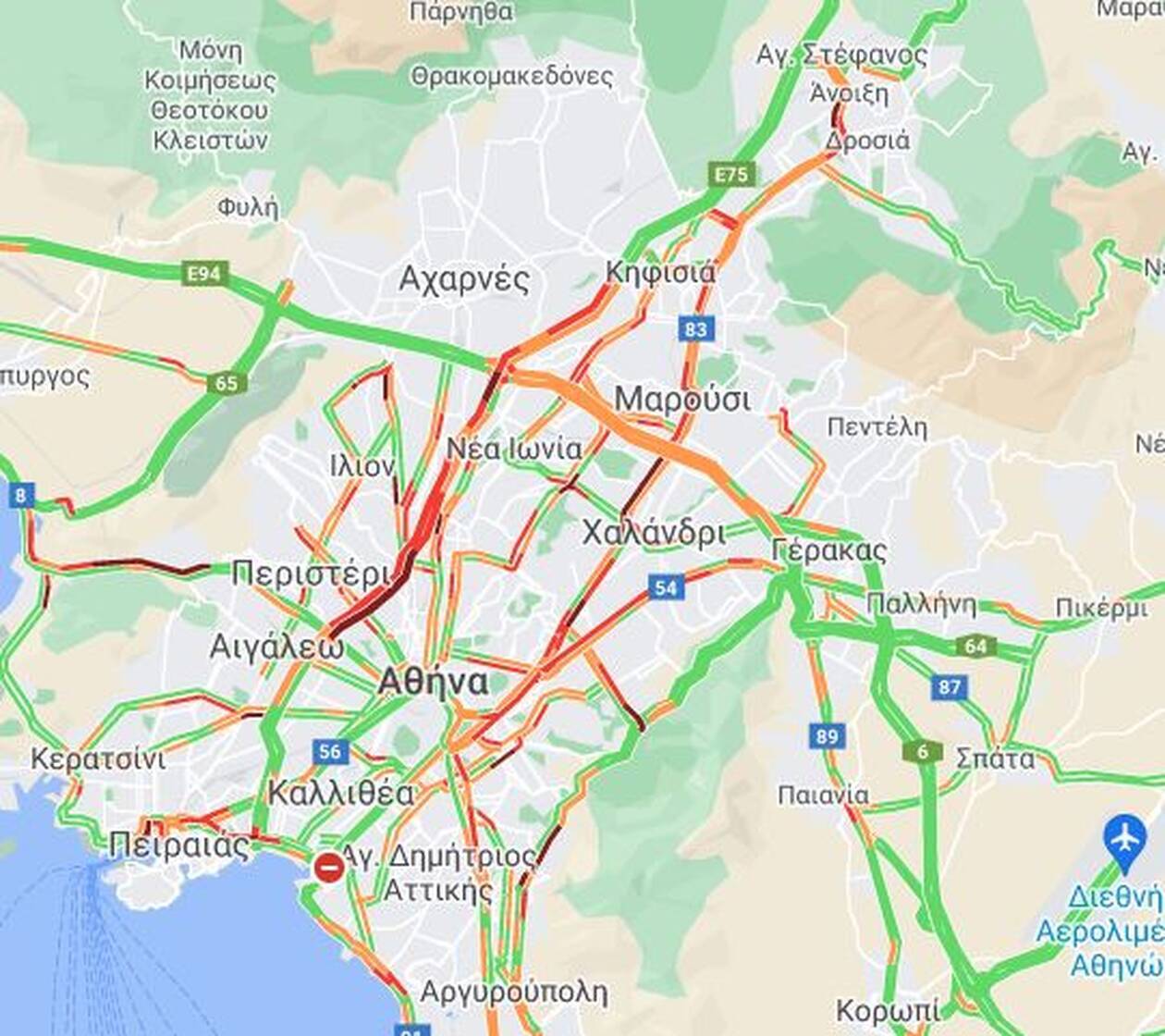 Πολύ μεγάλη κίνηση εντοπίζεται στον Κηφισό, τόσο στην άνοδο όσο και στην κάθοδο. Κίνηση υπάρχει και στους κεντρικούς δρόμους της Αθήνας, στη λεωφόρο Κηφισίας, την Κατεχάκη και τη Μεσογείων.