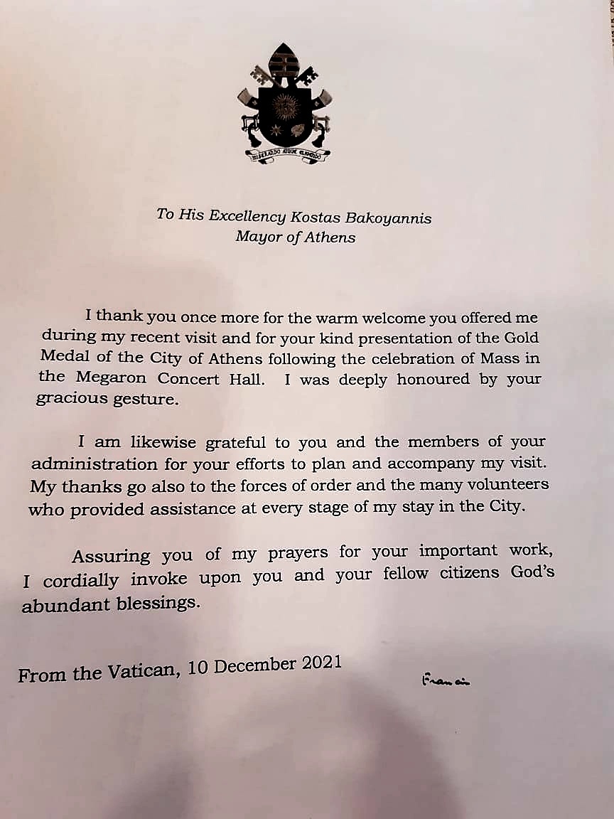 «Θα ήθελα να σας ευχαριστήσω ακόμα μια φορά για τη θερμή υποδοχή που μου επιφυλάξατε κατά τη διάρκεια της πρόσφατης επίσκεψής μου όπως και για την ευγενική σας χειρονομία να μου απονείμετε το Χρυσό Μετάλλιο της Πόλεως των Αθηνών, σε συνέχεια της Λειτουργίας στο Μέγαρο Αθηνών. Μια ευγενική χειρονομία που με τίμησε βαθύτατα» αναφέρει χαρακτηριστικά στην επιστολή του ο Πάπας Φραγκίσκος.
