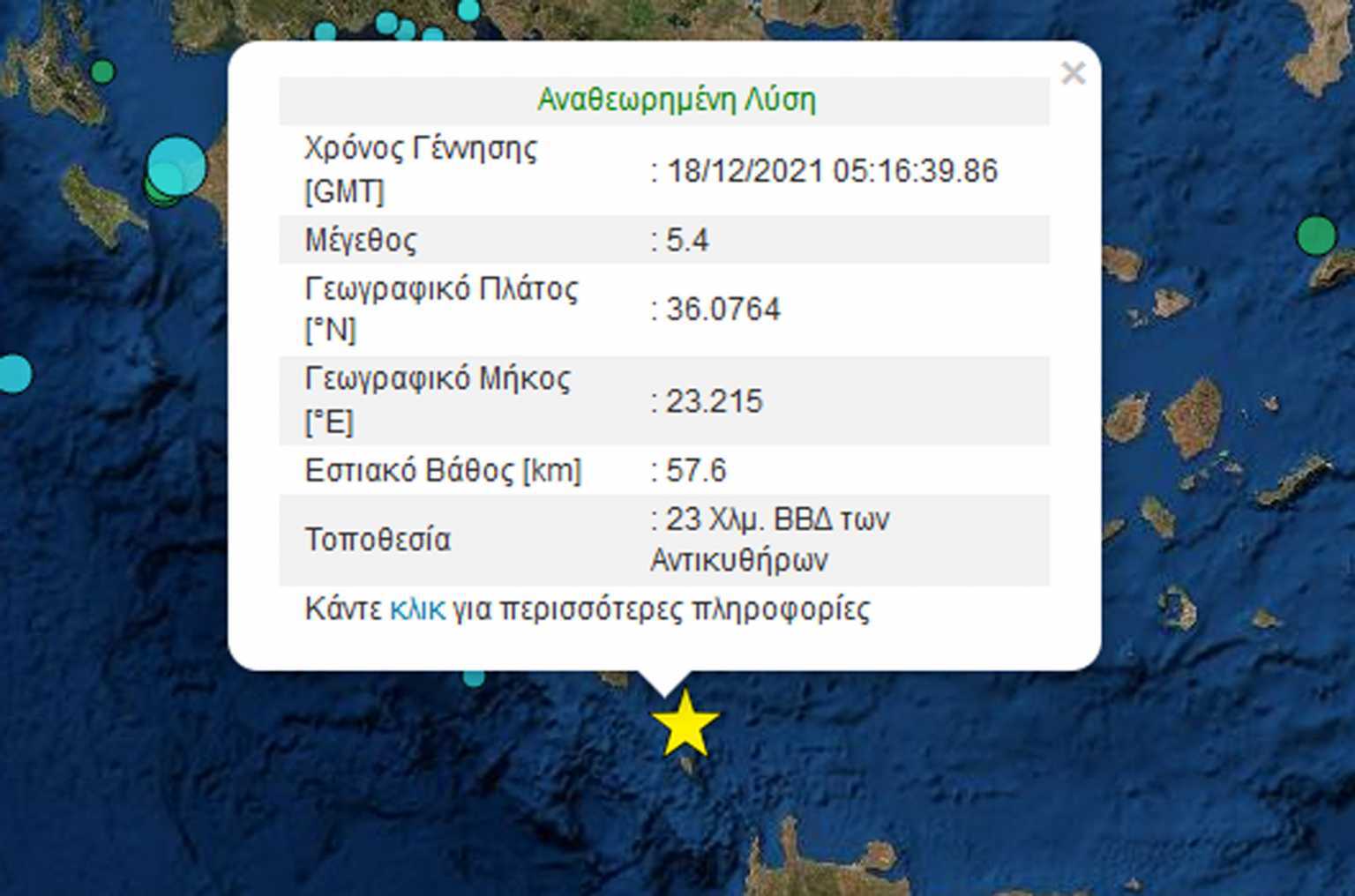 Σύμφωνα με το Γεωδυναμικό Ινστιτούτο ο σεισμός είχε εστιακό βάθος 57,6 χλμ και σημειώθηκε 23 χιλιόμετρα βόρεια από τα Αντικύθηρα και στη θαλάσσια περιοχή με τα Κύθηρα.