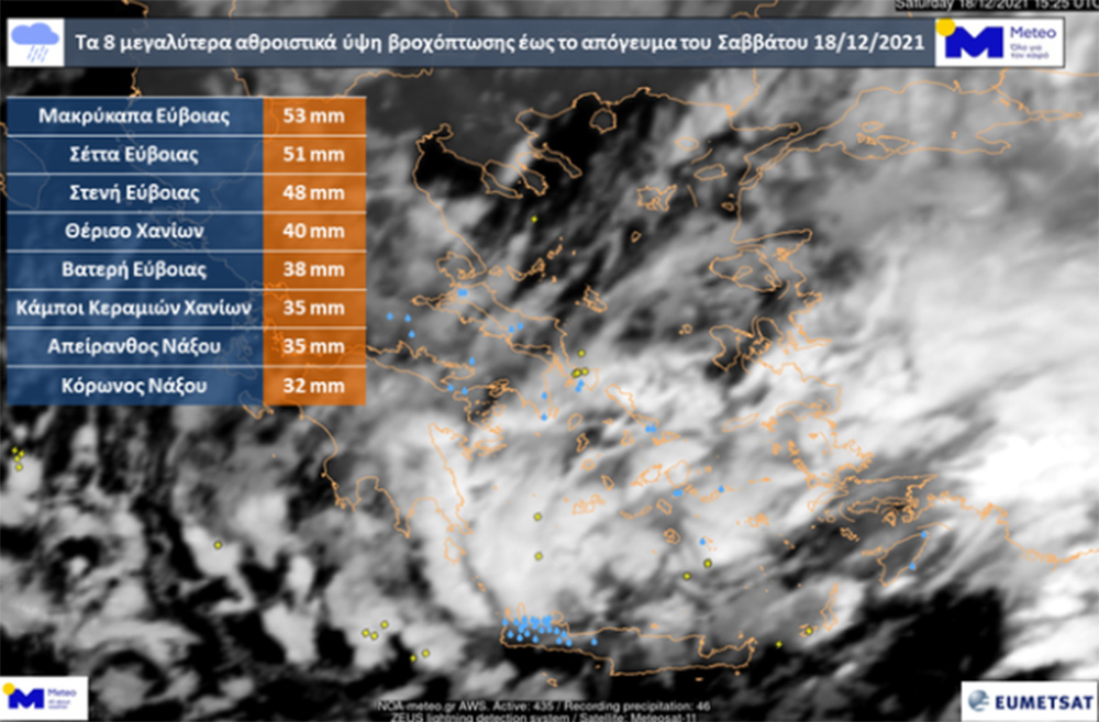 Σύμφωνα με την εικόνα του ευρωπαϊκού μετεωρολογικού δορυφόρου Meteosat-11, την οποία επεξεργάστηκε το Εθνικό Αστεροσκοπείο Αθηνών / meteo.gr, τις απογευματινές ώρες του Σαββάτου 18/12 φαινόμενα εκδηλώνονται στην Εύβοια, στην Κεντρική και Ανατολική Στερεά, στις Κυκλάδες και στην Κρήτη, ενώ σημαντικά ύψη βροχής καταγράφονται στην Εύβοια με το μεγαλύτερο ύψος να καταγράφεται στην Μακρυκάπα Εύβοιας με 53 mm.