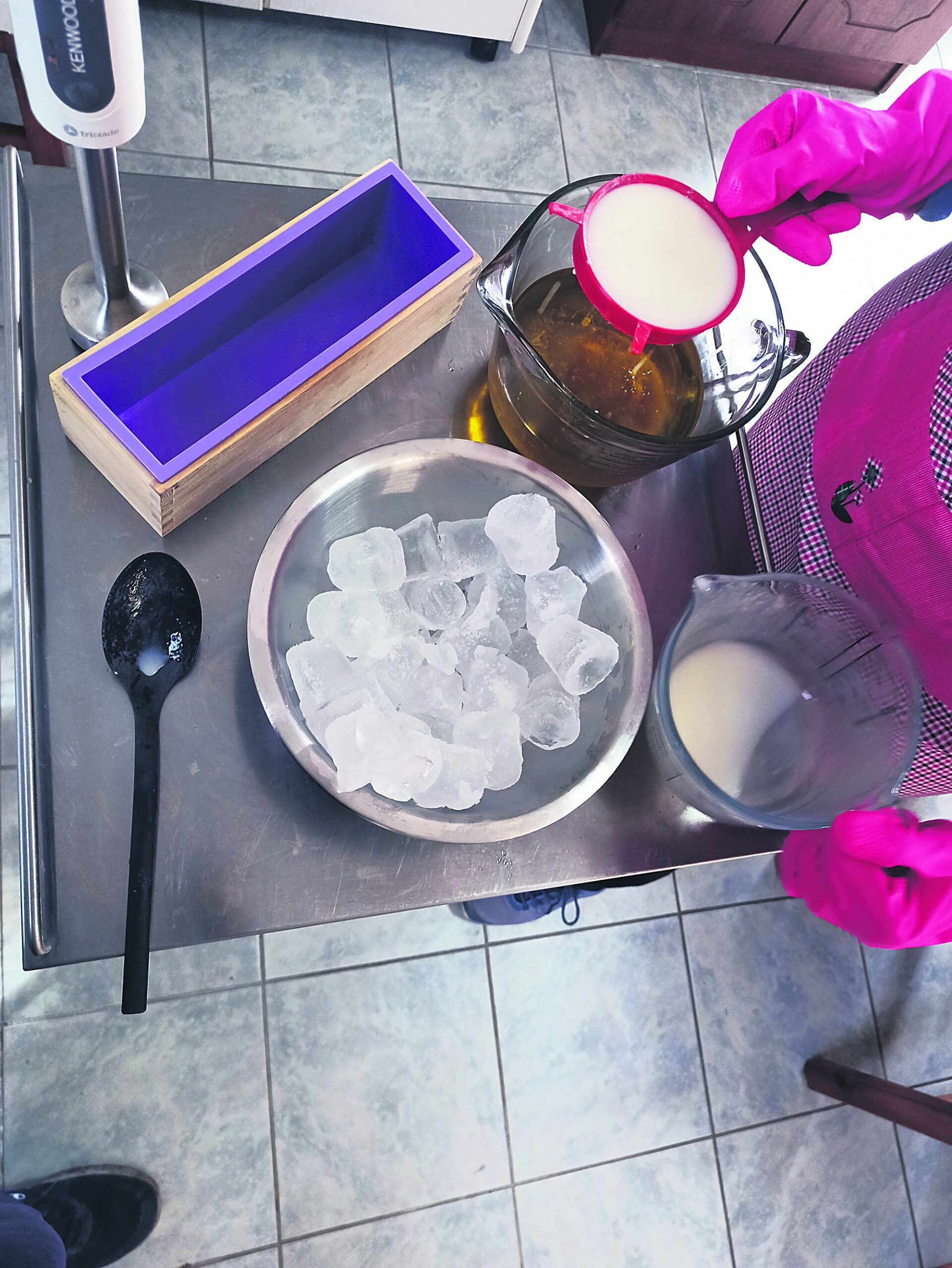 Ξεκινάμε να φτιάξουμε το σαπούνι μας πρώτα παγώνοντας το γάλα. Είναι απαραίτητο αυτό το βήμα για να μην καταστραφούν τα σάκχαρα, αλλά και όλα τα θρεπτικά συστατικά του από την υψηλή θερμοκρασία κατά τη διάρκεια της σαπωνοποίησης. Πρωταρχικό μέλημά μας είναι η ασφάλειά μας, για αυτό φοράμε γάντια κουζίνας, προσωπίδα για να προστατεύσουμε το πρόσωπό μας και μακριά ρούχα. Απομακρύνουμε από το χώρο παιδιά ή κατοικίδια. Ο χώρος που θα δουλέψουμε πρέπει να αερίζεται καλά. Προσθέτουμε την καυστική σόδα σιγά σιγά στα παγάκια του γάλακτος και ανακατεύουμε με σπάτουλα σιλικόνης ώστε να λιώσουν και να διαλυθεί η καυστική σόδα. Η θερμοκρασία του μίγματός μας δεν πρέπει να ξεπεράσει τους 23-25 βαθμούς Κελσίου. Μπορούμε να τοποθετήσουμε το σκεύος με το διάλυμα της καυστικής σόδας σε ένα μπολ με παγάκια για να διατηρήσουμε τη θερμοκρασία του χαμηλή. Το ελαιόλαδό μας πρέπει να είναι σε αντίστοιχη θερμοκρασία με αυτή του διαλύματος καυστικής σόδας.