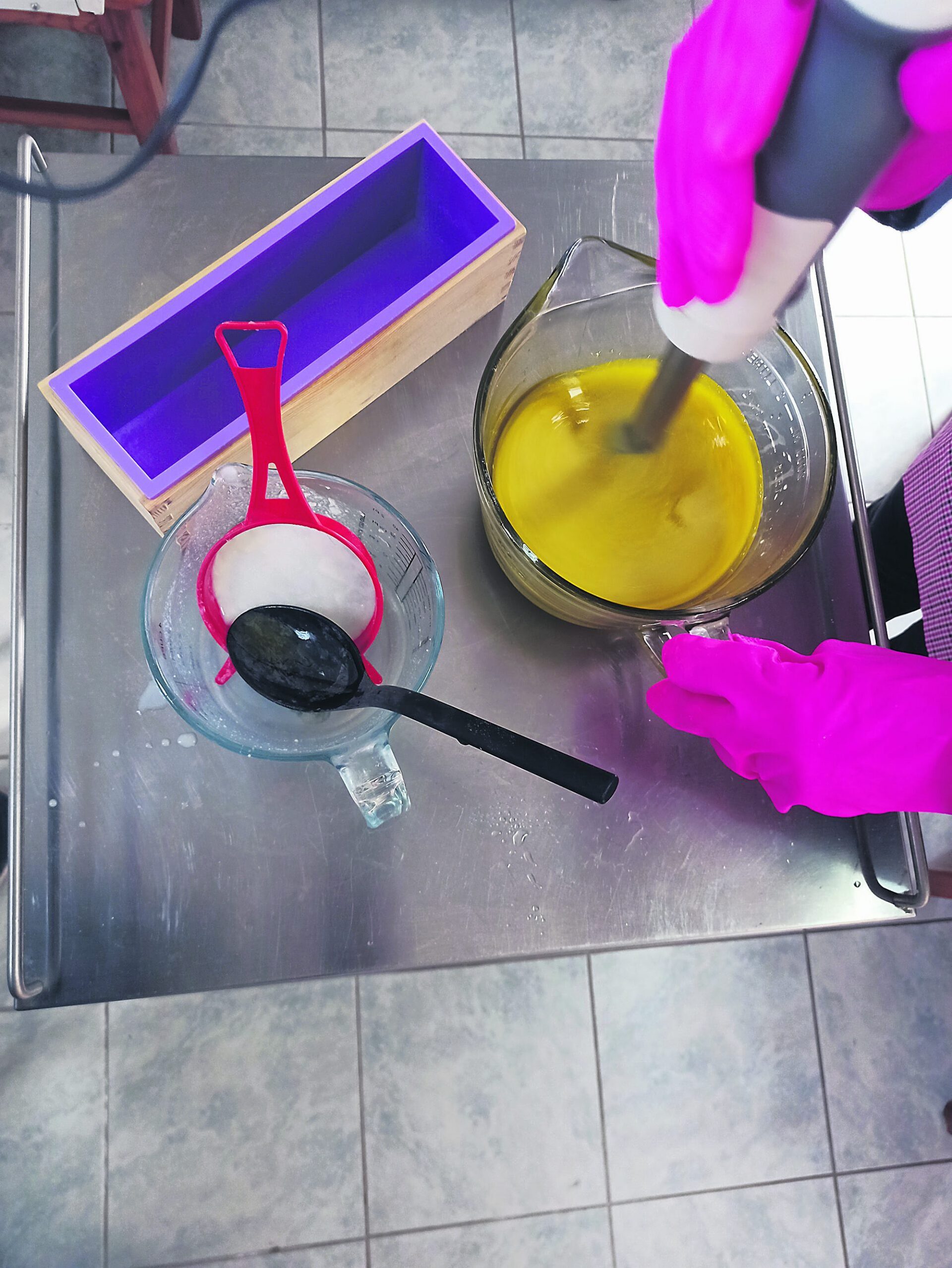 Προσθέτουμε το καυστικό διάλυμα στο μίγμα ελαίων και ανακατεύουμε με ένα ραβδομπλέντερ (με προσοχή γιατί πιτσιλάει), μέχρι να δούμε το μίγμα μας να αρχίσει να χυλώνει. Σε αυτό το στάδιο το βάζουμε σε φόρμα και το αφήνουμε για 3-4 μέρες ώσπου να σταθεροποιηθεί και να μπορούμε να το κόψουμε. Αφού το κόψουμε σε κομμάτια, θα πρέπει να το αφήσουμε για 2-3 μήνες σε καλά αεριζόμενο χώρο για να ωριμάσει και να είναι ασφαλές για χρήση.