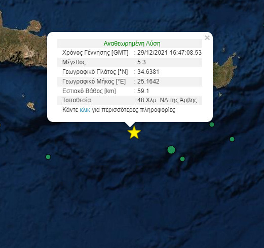 Σύμφωνα με την αναθεωρημένη λύση του Γεωδυναμικού Ινστιτούτου, λίγο πριν τις 19:00 σημειώθηκαν σεισμός 5,3 Ρίχτερ. Ο σεισμός σημειώθηκε 48 χιλ. νοτιοδυτικά της Άρβης, ενώ το εστιακό του βάθος εντοπίζεται στα 59,1 χλμ.