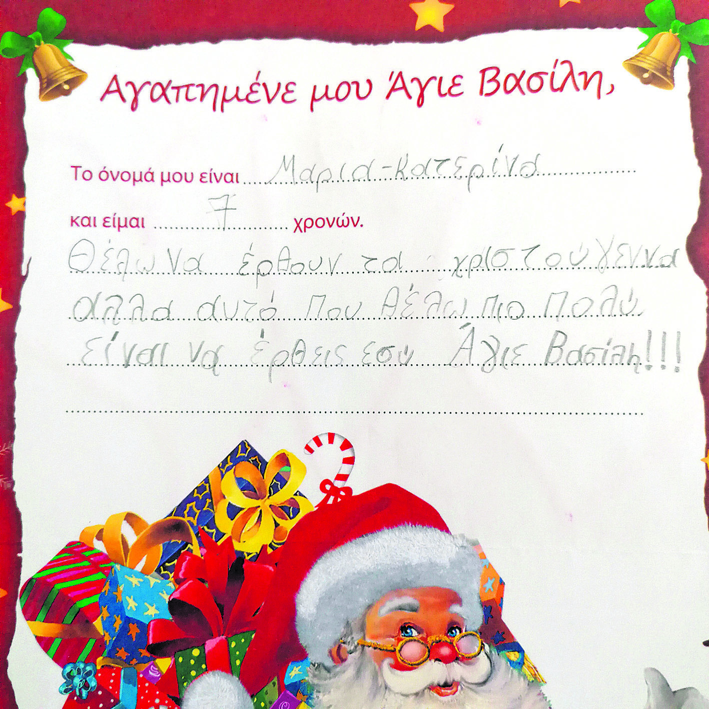 Στα περισσότερα γράμματα, τα παιδιά ζητούν παιχνίδια για εκείνα και τα αδέλφια τους, υγεία και αγάπη για όλον τον κόσμο, ενώ πολλά είναι εκείνα, όπως η 7χρονη Μαρία-Κατερίνα που ανυπομονούσε να έρθουν τα Χριστούγεννα, αλλά πάνω από όλα ήθελε να έρθει ο Αγιος Βασίλης…