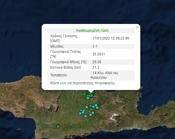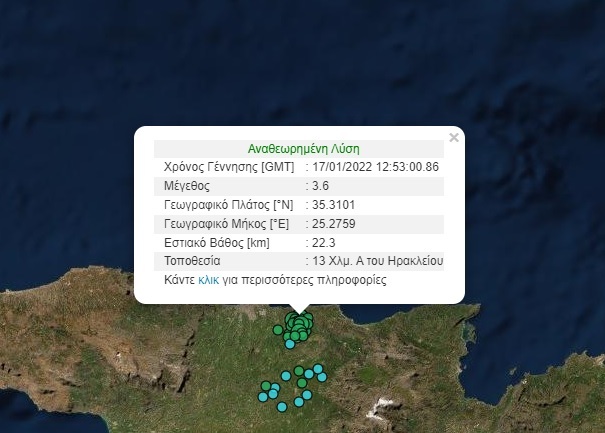 Η τρίτη σεισμική δόνηση 3,6 βαθμών της κλίμακας Ρίχτερ, καταγράφηκε 13χλμ ανατολικά του Ηρακλείου με εστιακό βάθος 22,3χλμ.