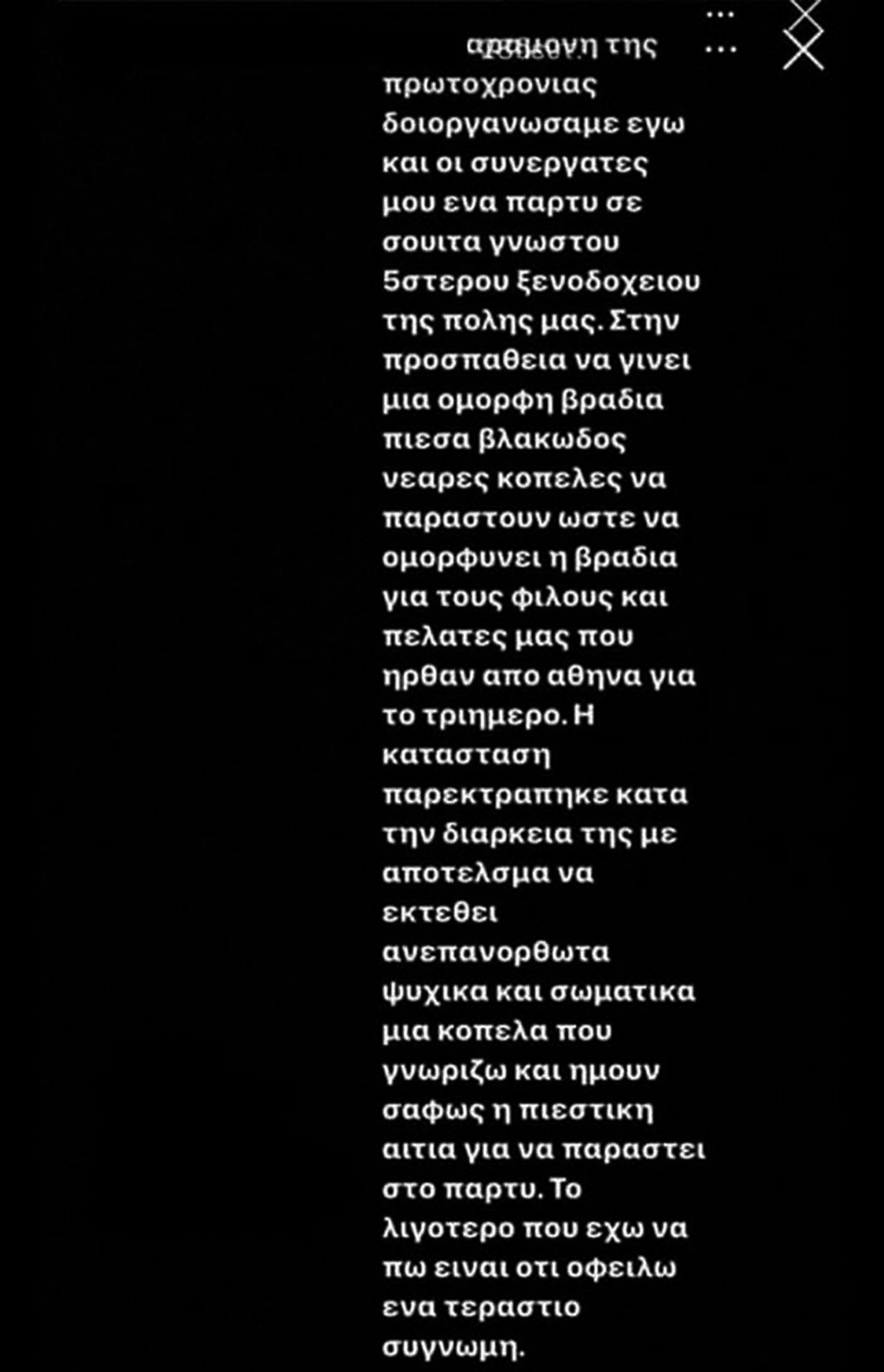 Η Αστυνομία συνέλαβε έναν 27χρονο, γόνο γνωστής επιχειρηματικής οικογένειας της Αθήνας, σε βάρος του οποίου σχηματίστηκε δικογραφία. Λίγες ημέρες μετά, η υπόθεση πήρε διαστάσεις μετά από καταιγισμό αναρτήσεων στα μέσα κοινωνικής δικτύωσης. Νεαρός που εργάζεται σε γνωστό μπαρ της Θεσσαλονίκης παραδέχτηκε στα social media ότι διοργάνωσε το πάρτι, γράφοντας χαρακτηριστικά: «Την παραμονή της Πρωτοχρονιάς διοργανώσαμε εγώ και οι συνεργάτες μου ένα πάρτι σε σουίτα γνωστού πεντάστερου ξενοδοχείου της πόλης μας. Στην προσπάθεια να γίνει μια όμορφη βραδιά, πίεσα βλακωδώς νεαρές κοπέλες να παραστούν ώστε να ομορφύνει η βραδιά για τους φίλους και πελάτες μας, που ήρθαν από την Αθήνα για το τριήμερο. Η κατάσταση παρεκτράπηκε κατά τη διάρκεια της νύχτας με αποτέλεσμα να εκτεθεί ανεπανόρθωτα ψυχικά και σωματικά μια κοπέλα που γνωρίζω και ήμουν σαφώς η πιεστική αιτία για να παραστεί στο πάρτι. Το λιγότερο που έχω να πω είναι ότι οφείλω ένα τεράστιο συγγνώμη».
