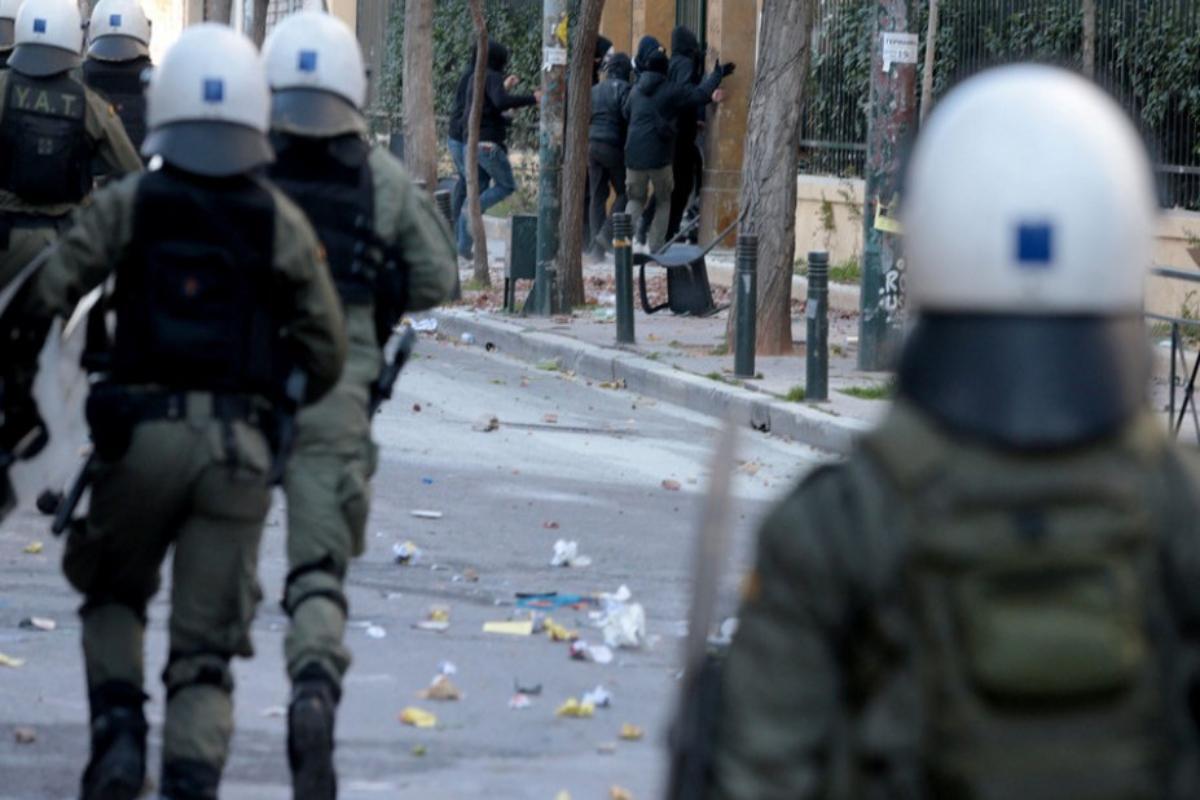 Συγκεκριμένα, οι κουκουλοφόροι πετάνε μάρμαρα στους άνδρες της αστυνομίας, οι οποίοι απαντούν με χημικά.
