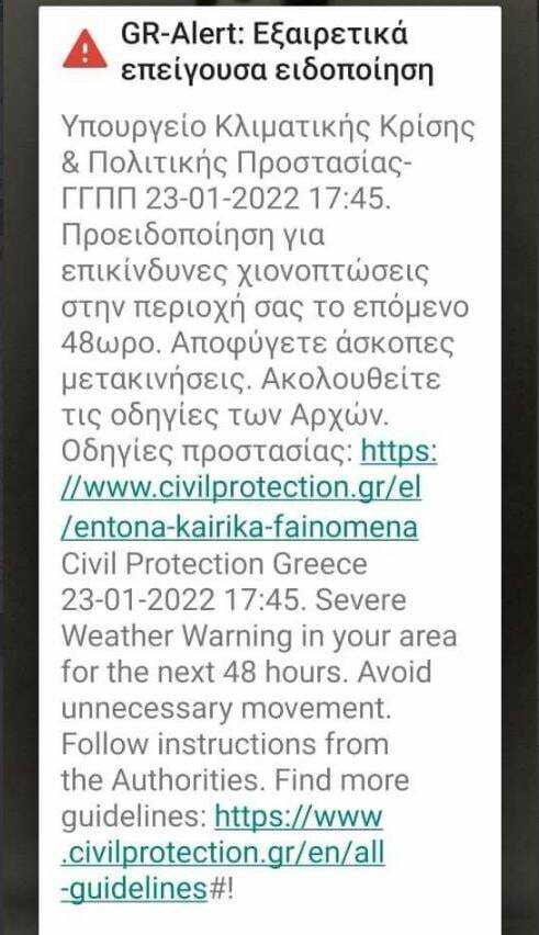 Επίσης, ενημερώνουμε ότι μέσω του 112, θα σταλεί όπου κριθεί απαραίτητο μήνυμα προς τους πολίτες με τις απαραίτητες οδηγίες και συστάσεις για τα έντονα καιρικά φαινόμενα (σημ: εστάλη ήδη σε Μαγνησία, Σποράδες, Φθιώτιδα, Εύβοια, βόρειες Κυκλάδες και Λήμνο).