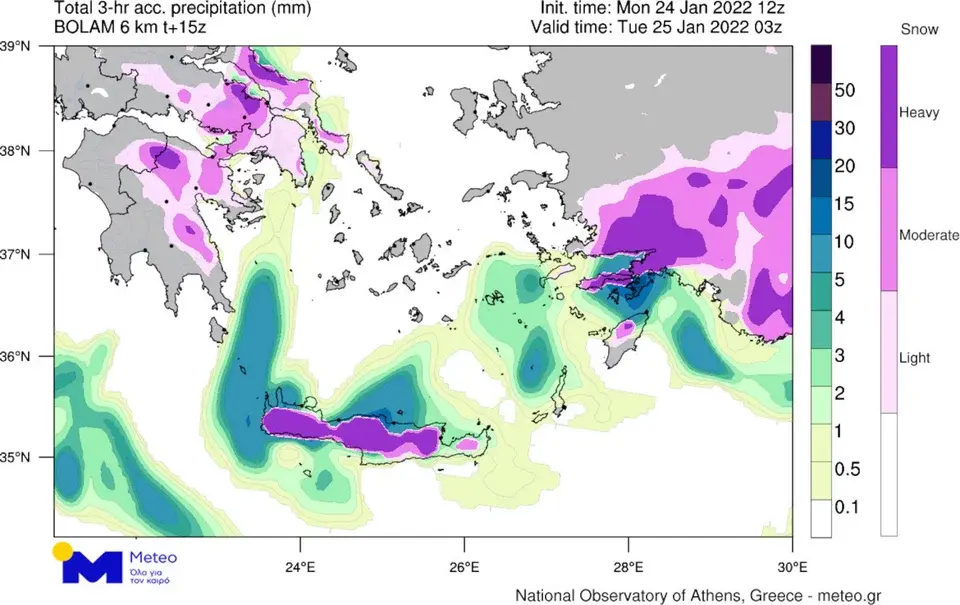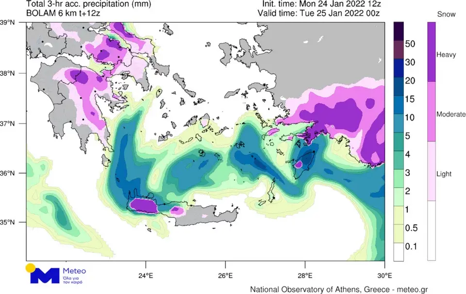 Στην παρακάτω ομάδα χαρτών, εμφανίζεται το εκτιμώμενο ύψος υετού ανά τρίωρο (μωβ αποχρώσεις χιόνι και μπλε αποχρώσεις βροχή/χιονόνερο), όπως υπολογίζεται από το αριθμητικό μοντέλο πρόγνωσης καιρού του Εθνικού Αστεροσκοπείου Αθηνών / Meteo.gr, από τις νυχτερινές έως τις πρωινές ώρες της Τρίτης 25/01/2022.