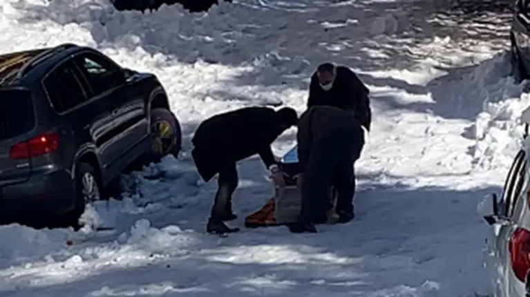 Στο βίντεο από την ομάδα «Μένουμε Ζωγράφου» φαίνεται η προσπάθεια τριών ανδρών να μετακινήσουν στα χιόνια το φέρετρο με τη βοήθεια μίας κουβέρτας.