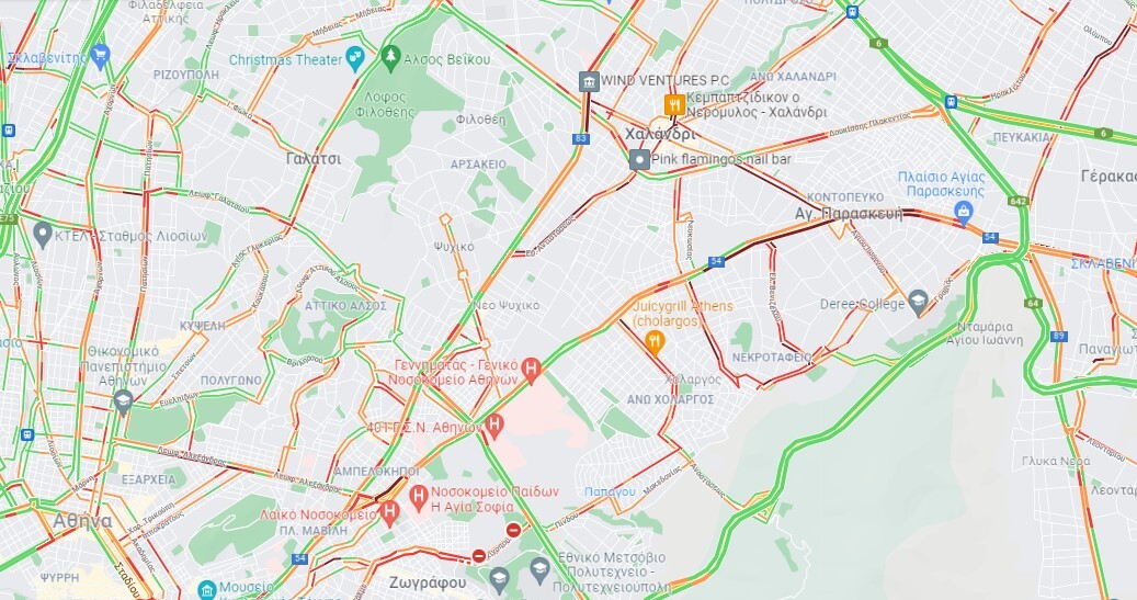 Στο κόκκινο είναι η κίνηση τόσο στην άνοδο όσο και στην κάθοδο στη λεωφόρο Κηφισίας, στο σημείο του νοσοκομείου «Μητέρα». Οι οδηγοί πρέπει να είναι ιδιαίτερα προσεκτικοί και στη λεωφόρο Αλεξάνδρας. Σημαντικά προβλήματα υπάρχουν στη Μεσογείων, τόσο στην Κατεχάκη όσο και στο ρεύμα προς Αγία Παρασκευή.
