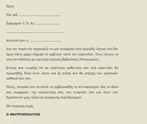 Στην ίδια επιστολή διαμηνύει ότι σε περίπτωση που ασθενήσουν από κορωνοϊό και εξαιτίας της επιλογής της αυτής θα απέχουν από τα ιερατικά τους καθήκοντα θα τιμωρηθούν, «διότι άνευ λόγου και εξ αιτίας σου θα απέχεις των ιερατικών καθηκόντων σου» όπως αναφέρει χαρακτηριστικά.