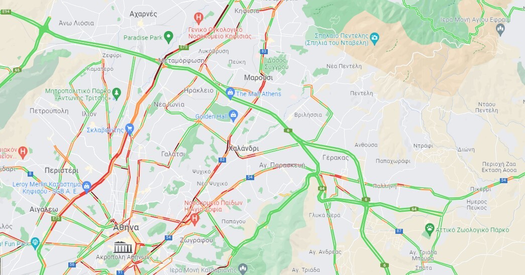 Τα γνωστά προβλήματα παρατηρούνται για ακόμη ένα απόγευμα στην Κηφισίας. Τόσο πλησίον του Γηροκομείου όσο και του Νέου Ψυχικού αλλά και στο κομμάτι από το νοκοκομείο «Μητέρα» μέχρι το Κολλέγιο Αθηνών οι οδηγοί πρέπει να οπλιστούν με ιδιαίτερη υπομονή.