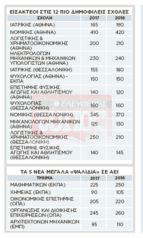 Ο «Ε.Τ.» παρουσιάζει το νέο αριθμό εισακτέων στις δημοφιλείς σχολές με την επιφύλαξη πάντα των αιφνιδιαστικών πρωτοβουλιών του υπουργείου Παιδείας, οι οποίες αλλάζουν μέρα με τη μέρα.