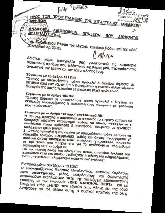 «Υφίσταμαι επιθέσεις επί προσωπικού, με εξυβριστικό και ιδιαίτερα απειλητικό χαρακτήρα (απειλές κατά της ζωής μου) από το ενεργό μέλος της οργάνωσής END κύριο Χρήστο Μπαλαντίνα, ο οποίος μάλιστα δηλώνει μέσω της διαφημιστικής ιστοσελίδας της εταιρίας του πως δραστηριοποιείται σε ‘‘εισαγωγές-εξαγωγές γενικού εμπορίου’’, ενώ στα μηνύματά του προς εμένα δηλώνει πως εισάγει όπλα και ‘‘εξοπλίζει τους Ελληνες’’ ώστε και εγώ ‘‘σαν προδότης, να φάω σφαίρες’’, οι οποίες μάλιστα δημοσιοποιήθηκαν με το ακριβές αυτό κείμενο στο www.facebook.com, μέσω σχολίων σε κοινή θέα και προσωπικών αναρτήσεων», αναφέρεται στη μήνυση.