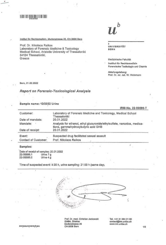 Όπως αναφέρεται στο πόρισμα που δημοσιεύει η ιστοσελίδα zougla.gr, στην πρώτη σελίδα η ώρα του «υπόπτου συμβάντος» ήταν στις 4:30 της 1ης Ιανουαρίου και η δειγματοληψία ούρων πραγματοποιήθηκε στις 21:00 της ίδιας ημέρας.