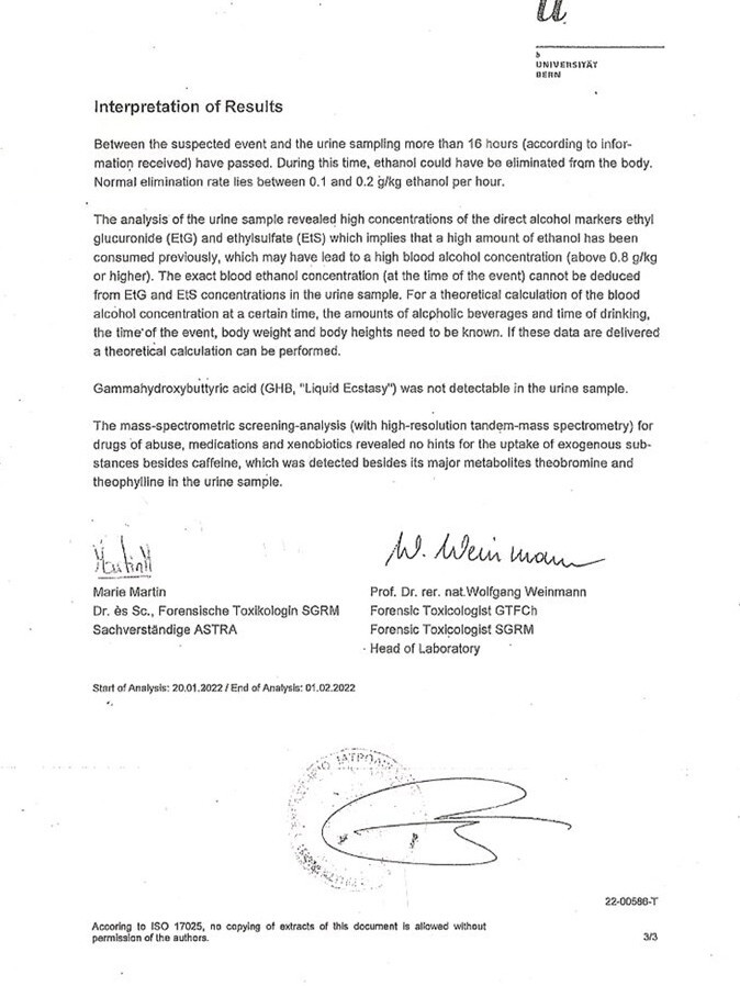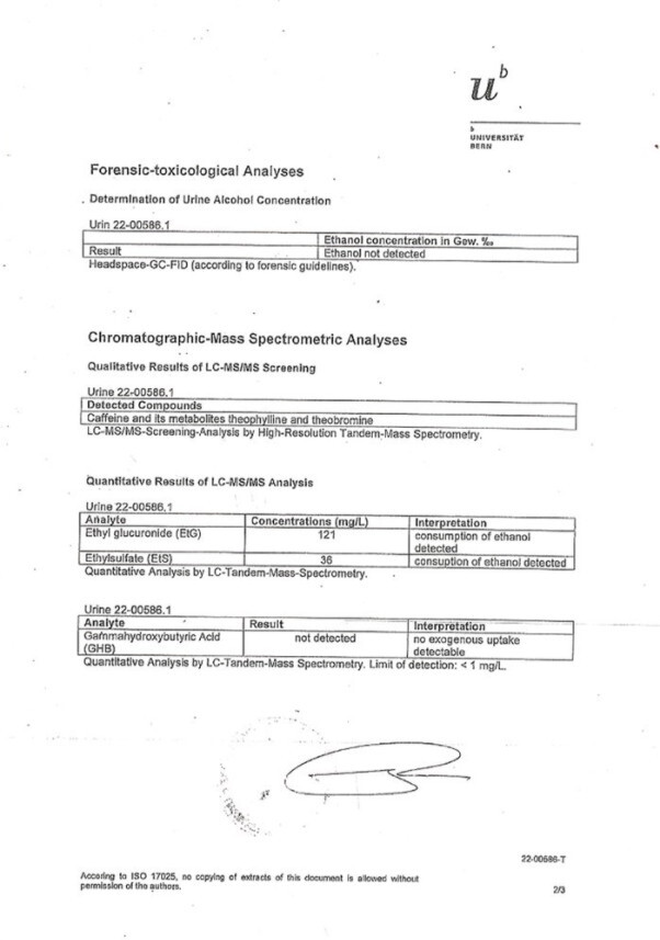 Σύμφωνα, λοιπόν, με το πόρισμα των Ελβετών επιστημόνων του Ινστιτούτου Ιατροδικαστικής, Τοξικολογίας και Χημείας της Βέρνης, στο οποίο είχαν αποσταλεί τα δύο δείγματα ούρων της 24χρονης «είναι λοιπόν πιθανόν η αιθανόλη να είχε αποβληθεί από το σώμα, αφού ο ρυθμός αποβολής της κυμαίνεται μεταξύ 0,1 και 0,2 gr ανά κιλό αιθανόλης ανά ώρα».