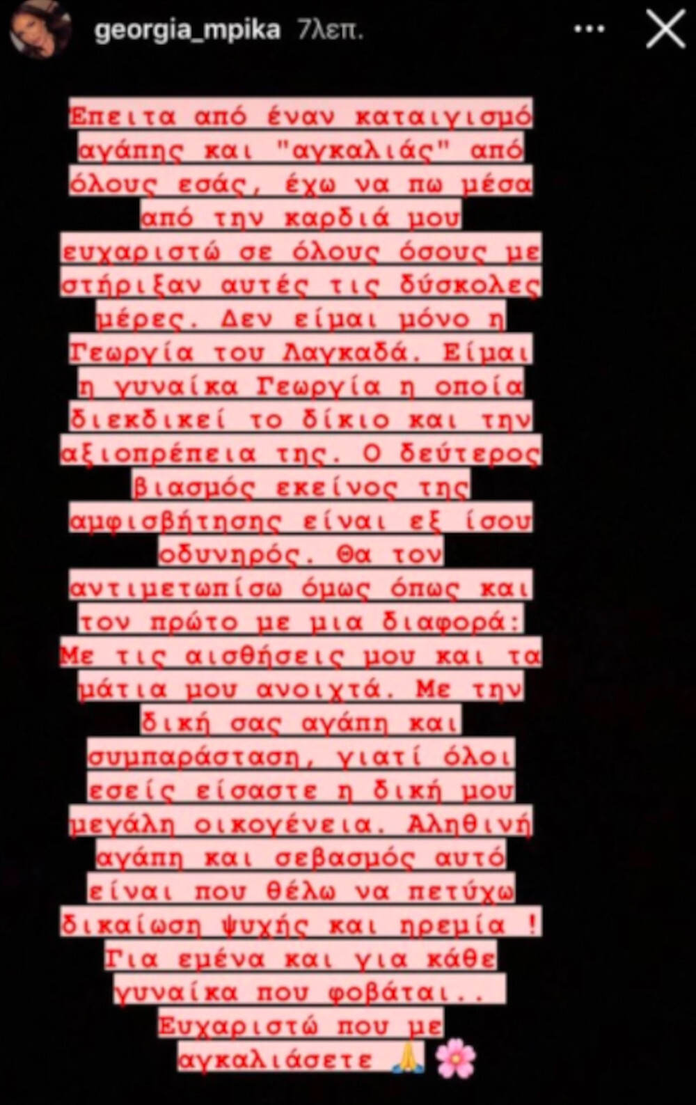 «Έπειτα από έναν καταιγισμό αγάπης και «αγκαλιάς» από όλους εσάς, έχω να πω μέσα από την καρδιά μου ευχαριστώ σε όλους όσους με στήριξαν αυτές τις δύσκολες μέρες. Δεν είμαι μόνο η Γεωργία του Λαγκαδά.