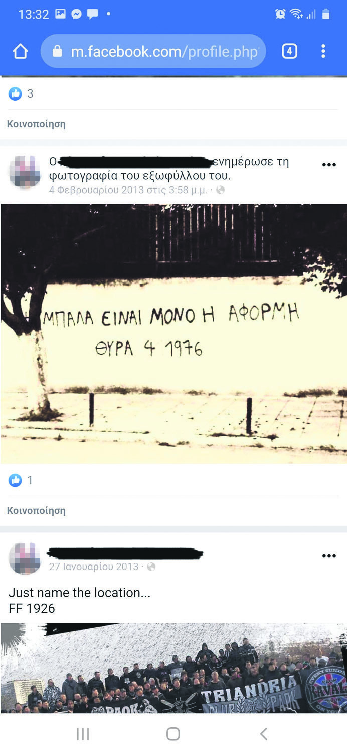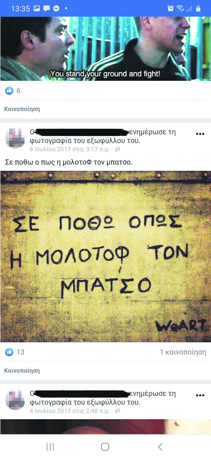 «Σε ποθώ όπως η μολότοφ τον μ…ο (αστυνομικό)», γράφει χαρακτηριστικά σε άλλη του ανάρτηση ο αποκαλούμενος και «Αθηναίος», καθώς πρόκειται για μέλος του συνδέσμου της οδού Μενάνδρου στην Ομόνοια, στον οποίο μπήκε λουκέτο λόγω των «επικίνδυνων» ευρημάτων που εντόπισε η ΕΛ.ΑΣ. Στη φωτογραφία εξωφύλλου της σελίδας του στο facebook, αποτυπώνεται σύνθημα σε τοίχο που γράφει: «Μπάλα είναι μόνο η αφορμή». Από τις δεκάδες φωτογραφίες που ανεβάζει στα μέσα κοινωνικής δικτύωσης, ο 25χρονος σήμερα χούλιγκαν φαίνεται να παρακολουθεί και να ακολουθεί τον σκληρό οπαδικό πυρήνα των συνδέσμων του ΠΑΟΚ για τουλάχιστον 11 χρόνια.
