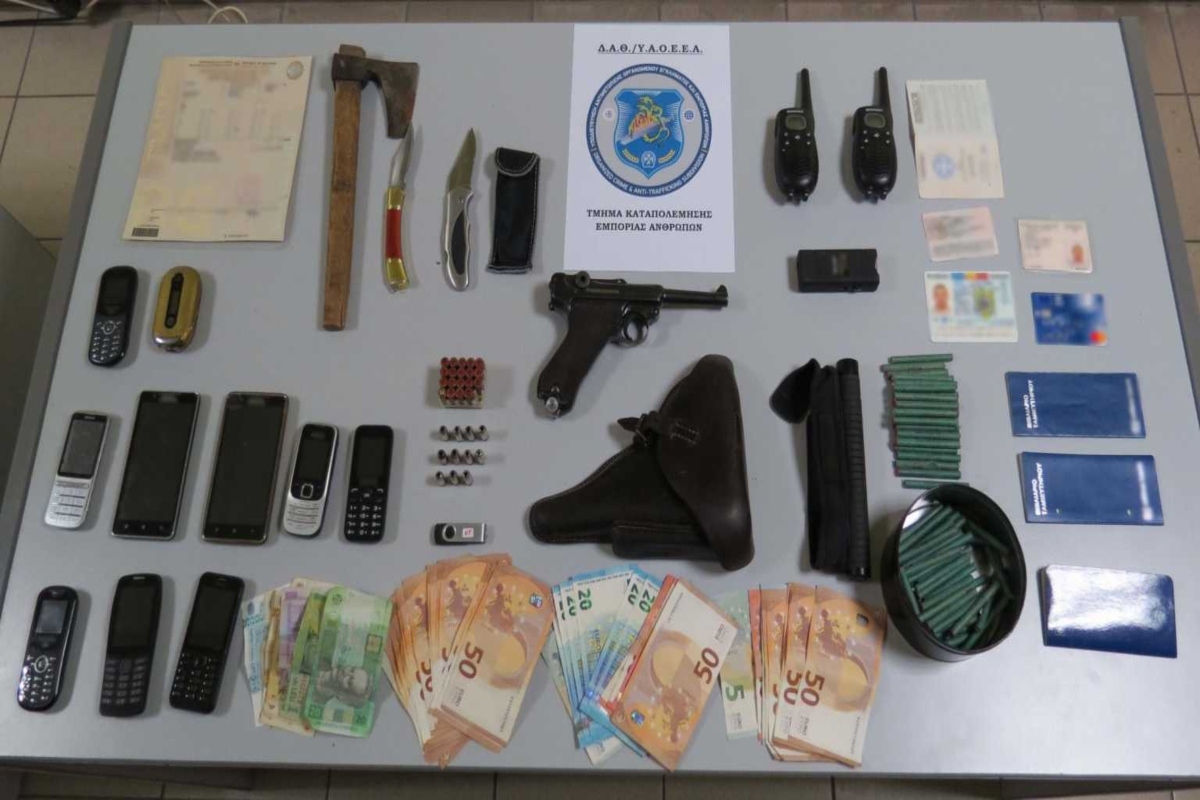 Σε έρευνες που ακολούθησαν σε δύο ΙΧ αυτοκίνητα ιδιοκτησίας των συλληφθέντων και στα σπίτια τους βρέθηκαν και κατασχέθηκαν – μεταξύ άλλων – ένα πιστόλι, φυσίγγια, ένα τσεκούρι, μια πλαστή ταυτότητα και μια πλαστή ρουμανική άδεια οδήγησης με φερόμενο κάτοχο τον συλληφθέντα, σωρεία προσωπικών εγγράφων εκδιδόμενων προσώπων και έγγραφα που σχετίζονται με οίκους ανοχής κ.ά.