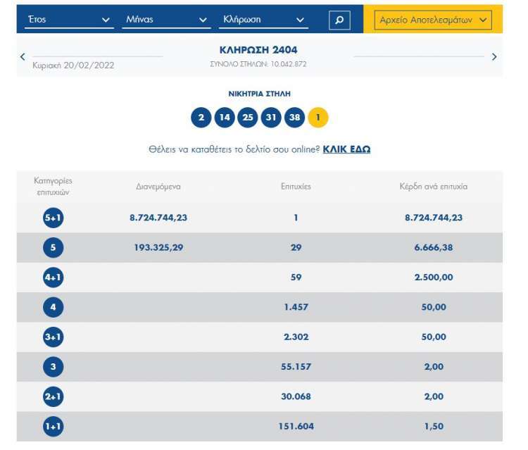 Πρόκειται για το μεγαλύτερο διανεμόμενο ποσό στην πρώτη κατηγορία του παιχνιδιού τους τελευταίους 18 μήνες. Συγκεκριμένα, τον Αύγουστο του 2020 ένας τυχερός παίκτης είχε κερδίσει 7,7 εκατ. ευρώ.