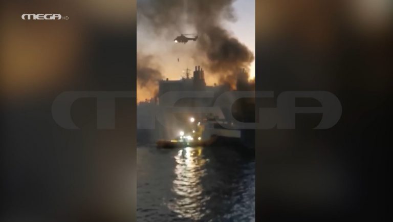 Σοκάρουν οι εικόνες που παρουσίασε το MEGA από το γκαράζ του πλοίου, την στιγμή της εκκένωσης, αλλά και τηn στιγμή που επιβάτες και πλήρωμα επιβιβάζονται σε σκάφη για να σωθούν από την πύρινη κόλαση.