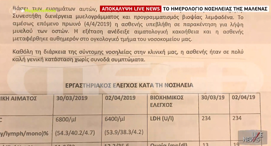 Υπογραμμίζει, επίσης, ότι εκείνη ήταν που ζήτησε να γίνει νεκροτομή στη Μαλένα, ώστε να διαλευκανθεί εάν υπάρχει κάτι κληρονομικό, “να προλάβουμε κάποιο επόμενο θάνατο”. Σύμφωνα με την μαρτυρία της, οι γονείς τότε είχαν συμφωνήσει. Η παιδοογκολόγος μιλά επίσης για τη συμπεριφορά της μητέρας και του πατέρα ενώ η Μαλένα νοσηλευόταν, ενώ αναφέρει ότι η επιλογή του μονόκλινου δωματίου “είναι επιλογή του γιατρού ανάλογα με το στάδιο της νόσου”.