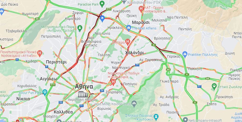 Με μειωμένη ταχύτητα διεξάγεται η κυκλοφορία στην Κηφισίας. Μαρούσι, Χαλάνδρι αλλά και Νέο Ψυχικό είναι στο κόκκινο. Φυσικά ακινητοποιημένα παραμένουν τα οχήματα από την έξοδο της Κατεχάκη μέχρι και τον Ευαγγελισμό.