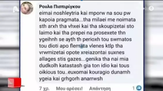 «Ο Μάνος είναι πολύ ενοχλημένος με διάφορα πράγματα που λέγονται. Στην ίδια συζήτηση μού είπε: “Θέλω να πω εκεί που πρέπει όσα ξέρω, όσα έχω ζήσει. Κανένας δεν μπορεί να με αναιρέσει. Κανένας δεν μπορεί να αμφισβητήσει εμένα. Είμαι ο πιο άμεσος και είμαι ο πρώτος που θα την σκότωνα εάν είχα έστω και μισή υποψία. Δεν έχω την υποψία και πιστεύω ότι δεν υπάρχει καμία περίπτωση, αυτό πιστεύω μέσα μου. Μόνο εγώ δεν έχω πιστέψει ότι το έχει κάνει η Ρούλα. Κλείνω την τηλεόραση για να μην επηρεαστώ’» συμπληρώνει.