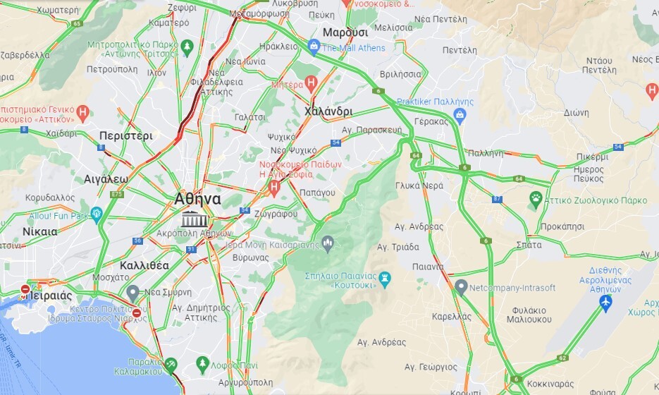 Συγκεκριμένα, από τη Μεταμόρφωση μέχρι και τη Νέα Φιλαδέλφεια η κίνηση διεξάγεται με ιδιαίτερη δυσκολία. Στο κόκκινο είναι και ο οδικός άξονας από τα ΚΤΕΛ Άνω Λιοσίων μέχρι και τα Άνω Πατήσια.