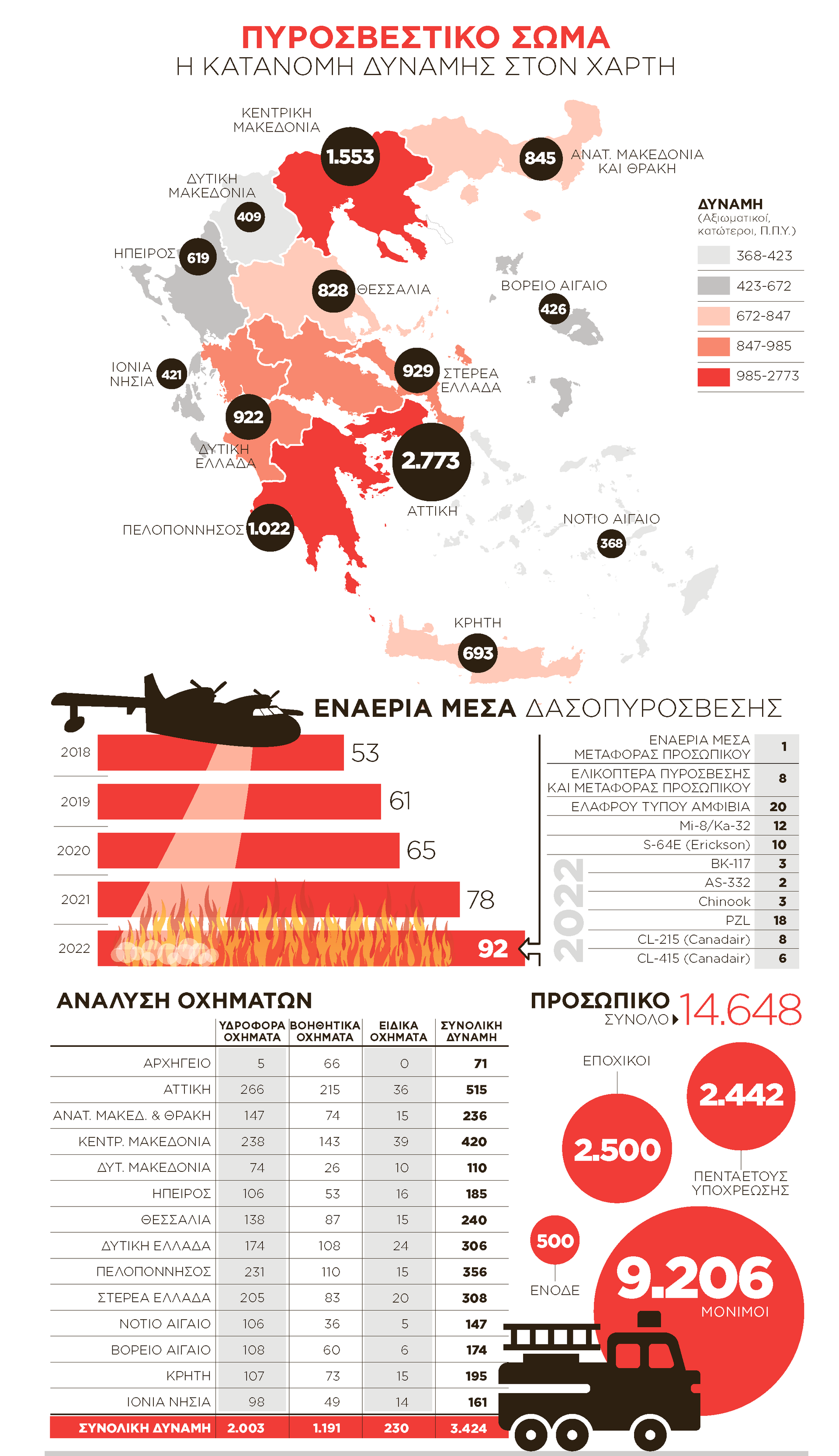 Συγκεκριμένα 14 Canadair (8 CL-215 και 6 CL-415), 18 Πετζετέλ και 20 ελαφρού τύπου αμφίβια αεροσκάφη πρόκειται να διατεθούν για την εναέρια πυρόσβεση. Οσον αφορά τα ελικόπτερα, ο σχεδιασμός περιλαμβάνει 10 Erickson, 3 BK-117, 2 Super Puma και 3 Chinook. Ο πόλεμος στην Ουκρανία αναμένεται να επηρεάσει την προμήθεια ελικοπτέρων και αεροσκαφών, καθώς κατά τη φετινή αντιπυρική περίοδο δεν θα «επιστρατευτεί» το ρωσικό Beriev. Οι εναλλακτικές λύσεις που εξετάζονται περιλαμβάνουν ένα C-130 με δυνατότητα ρίψης επιβραδυντικού υγρού, ενοικίαση μεγάλων γαλλικών ή αμερικανικών αεροσκαφών με την ίδια δυνατότητα, ενώ παράλληλα εξετάζεται και το ενδεχόμενο προμήθειας ελαφρών ή μεσαίου τύπου αεροσκαφών. Ταυτόχρονα, μένει να εξακριβωθεί εάν θα υπάρχει πρόβλημα με τα 12 Mi-8/Ka-32 ουκρανικής παραγωγής. Στις επιχειρήσεις θα συνδράμουν και 8 ελικόπτερα πυρόσβεσης και μεταφοράς προσωπικού, αλλά και ένα ακόμα εναέριο μέσο που θα διατεθεί για τη μετακίνηση πυροσβεστών. Ο επίγειος στόλος θα αποτελείται από συνολικά 3.424 οχήματα, τα 2.003 εκ των οποίων θα είναι υδροφόρα. Από τα υπόλοιπα, τα 1.191 είναι βοηθητικά, ενώ διαθέσιμα θα είναι και 230 ειδικά οχήματα.