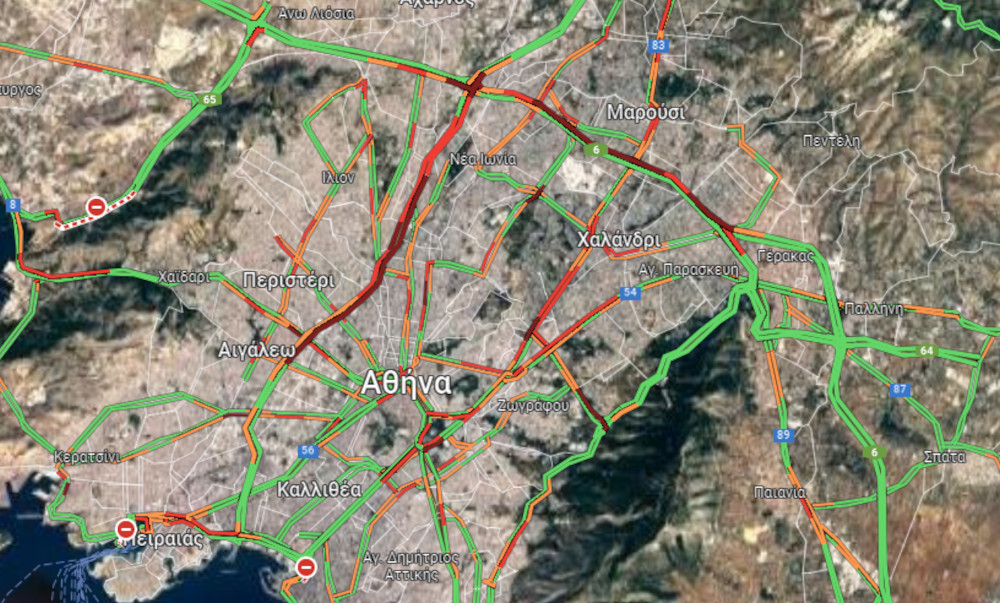 Μεγάλη είναι η ταλαιπωρία των οδηγών στη λεωφόρο Κηφισού και στα δύο ρεύματα, από τη Μεταμόρφωση ως το Αιγάλεω. Επιπλέον, συμφόρηση παρατηρείται στο ρεύμα της Αττικής οδού από το σταθμό Δουκίσσης Πλακεντίας ως τον κόμβο της Μεταμόρφωσης.