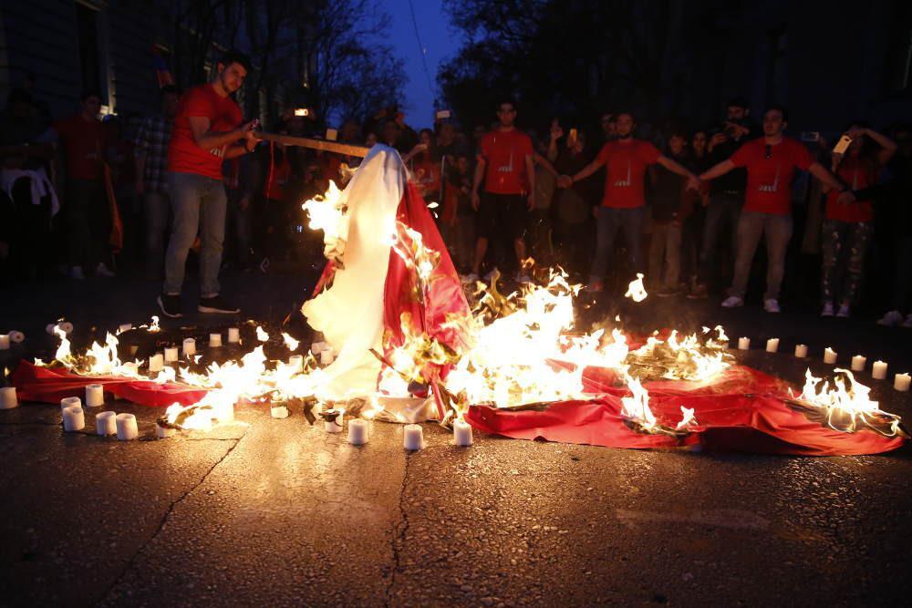 Άνδρες των ΜΑΤ ψέκασαν με χημικά προς το πλήθος. Νωρίτερα οι Αρμένιοι στην πορεία τους είχαν κάψει τουρκική σημαία.