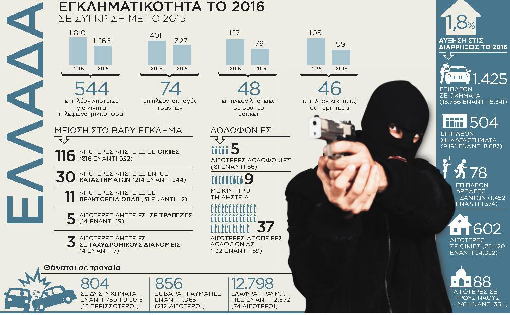 Σε σχέση με το 2015 καταγράφηκαν σημαντικά περισσότερες αρπαγές τσαντών, ληστείες για κινητά τηλέφωνα και μικροποσά, ληστείες σε μίνι μάρκετ, περίπτερα και πρατήρια υγρών καυσίμων. Ενδεικτικό είναι ότι το 2016 έγιναν 544 επιπλέον ληστείες για κινητά τηλέφωνα και μικροποσά (1.810 έναντι 1.266 που ήταν το 2015), 74 επιπλέον αρπαγές τσαντών (401 έναντι 327 το 2015), 48 επιπλέον ληστείες σε σούπερ μάρκετ (127 έναντι 79 το 2015) και 46 επιπλέον ληστείες σε περίπτερα (105 έναντι 59 το 2015).