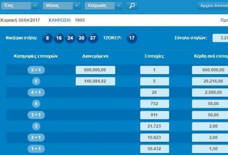 Οι τυχεροί αριθμοί ήταν 8,16,24,30,37 και αριθμός Τζόκερ: 17.