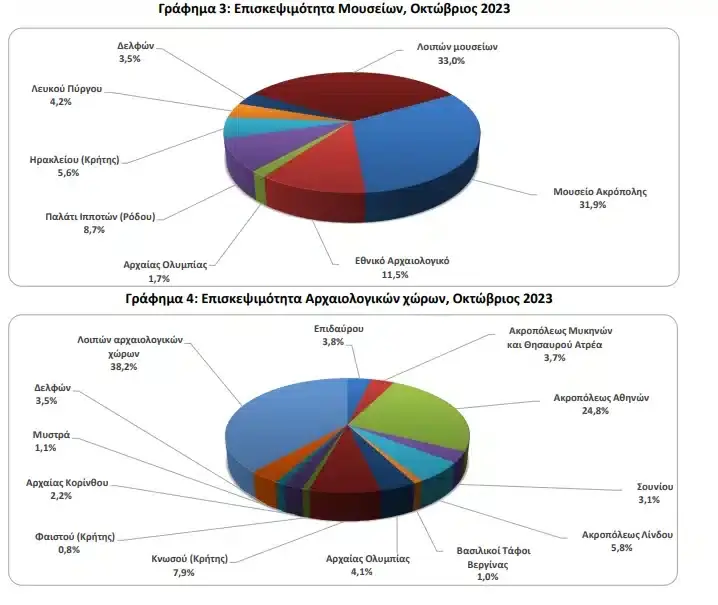 Σύμφωνα επίσης με την ΕΛΣΤΑΤ, στους αρχαιολογικούς χώρους, τον Οκτώβριο 2023 σε σύγκριση με τον αντίστοιχο μήνα του 2022, καταγράφεται αύξηση των επισκεπτών κατά 9%, μείωση των επισκεπτών ελεύθερης εισόδου κατά 3,6% και αύξηση των εισπράξεων κατά 10,4%.