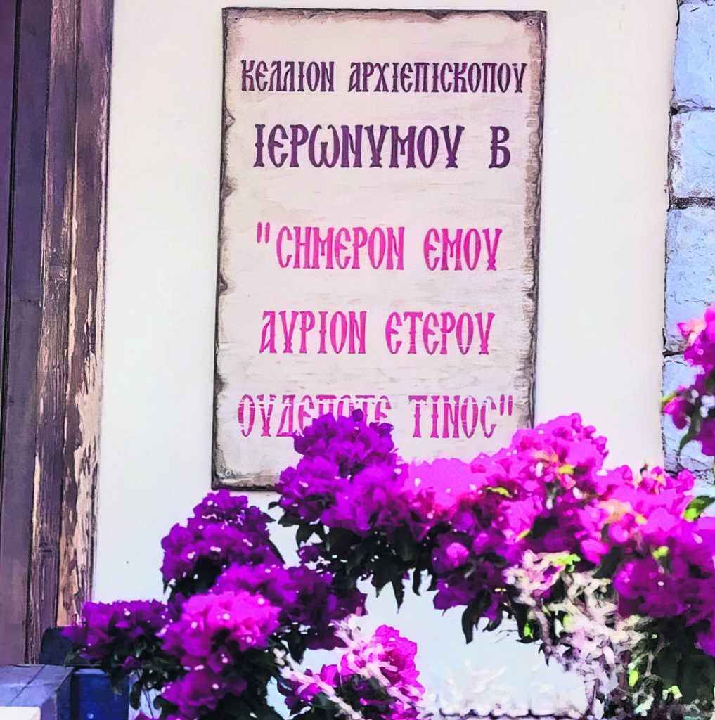Ο Αρχιεπίσκοπος δεν παρέλειψε να ξεναγήσει τους καλεσμένους του στο μοναστήρι, το οποίο ξεκίνησε να αναστηλώνει από τότε που ήταν μητροπολίτης Θηβών. Το μοναστήρι αυτό είναι και το καλοκαιρινό ησυχαστήριο του Αρχιεπισκόπου. Από εκεί αγναντεύει τη θάλασσα του Κορινθιακού, συγκεντρώνει υλικό για τα βιβλία του, γράφει και προσεύχεται. Είναι χαρακτηριστικό πως έξω από το κελί του έχει βάλει και την επιγραφή «Σήμερον εμού, αύριο ετέρου και ουδέποτε τινός»!